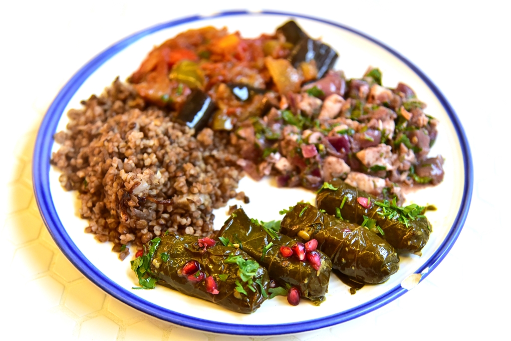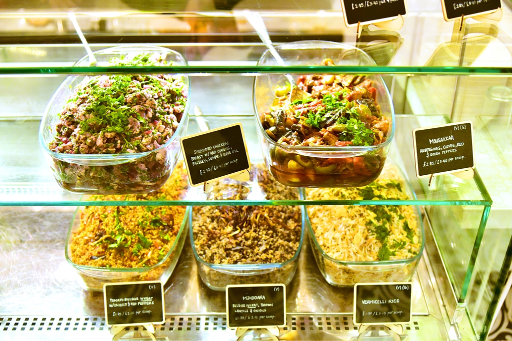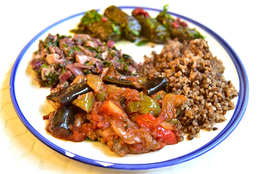 2. Mousakkaa + Mjaddara+ Stuffed Vegetarian Vineleaves + Shredded Chicken Breast with Red Onions (12.30 GBP) – มะเขือม่วงตุ๋น ข้าวสาลีถั่วเลนทิล ข้าวห่อใบองุ่นและเนื้ออกไก่กับหอมแดง