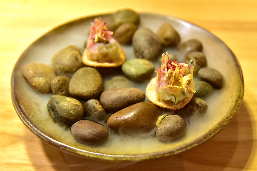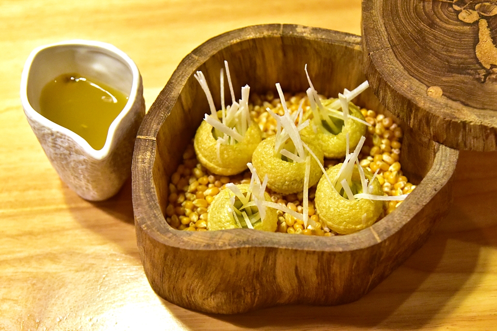 3. Pani Puri, passion fruit, avocado, jicama (290++ THB) [16/20] – แป้งกรอบไส้อโวคาโด้และมันแกวเส้นเสิร์ฟคู่กับน้ำเสาวรสปรุงรสรสเปรี้ยวจี๊ดจ๊าด วิธีการทานต้องเริ่มจากการเทน้ำเสาวรสลงไปในตัวแป้งกลมจนเต็มและเข้าปากในคำเดียว อูมามิสุดๆ