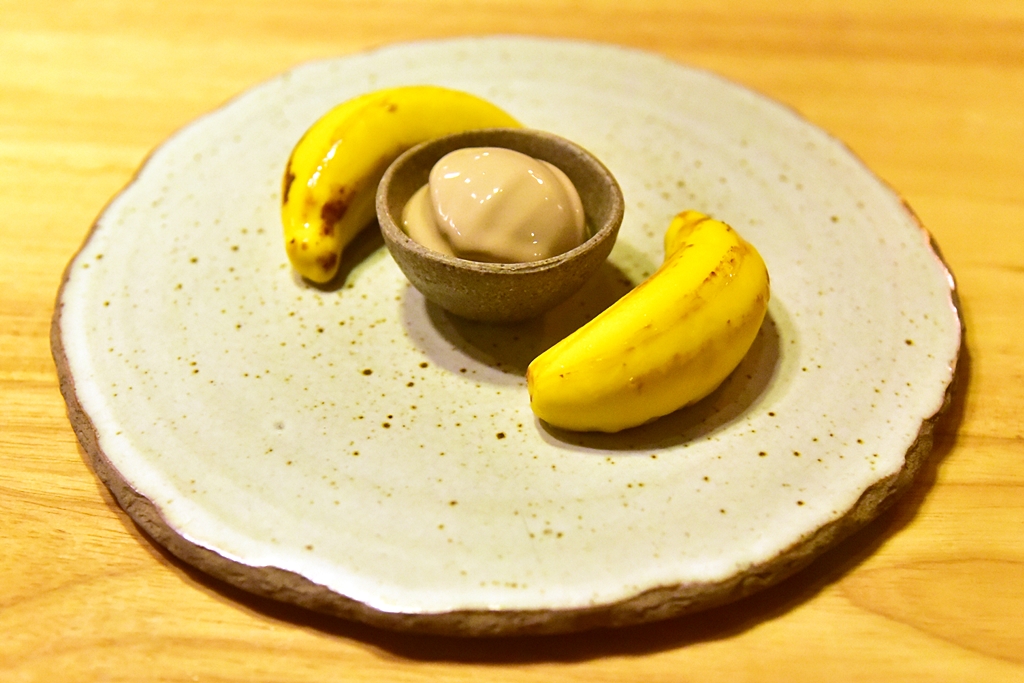 9. Baby Banana, cardamom, filter kaapi ice cream (290++ THB) [14/20] – “กล้วยจิ๋ว” ที่เป็นมูสกล้วยห่อด้วยช็อกโกแลตหน้าตาน่ารักเสิร์ฟคู่กับไอศกรีมกาแฟรสชาติเข้ากัน