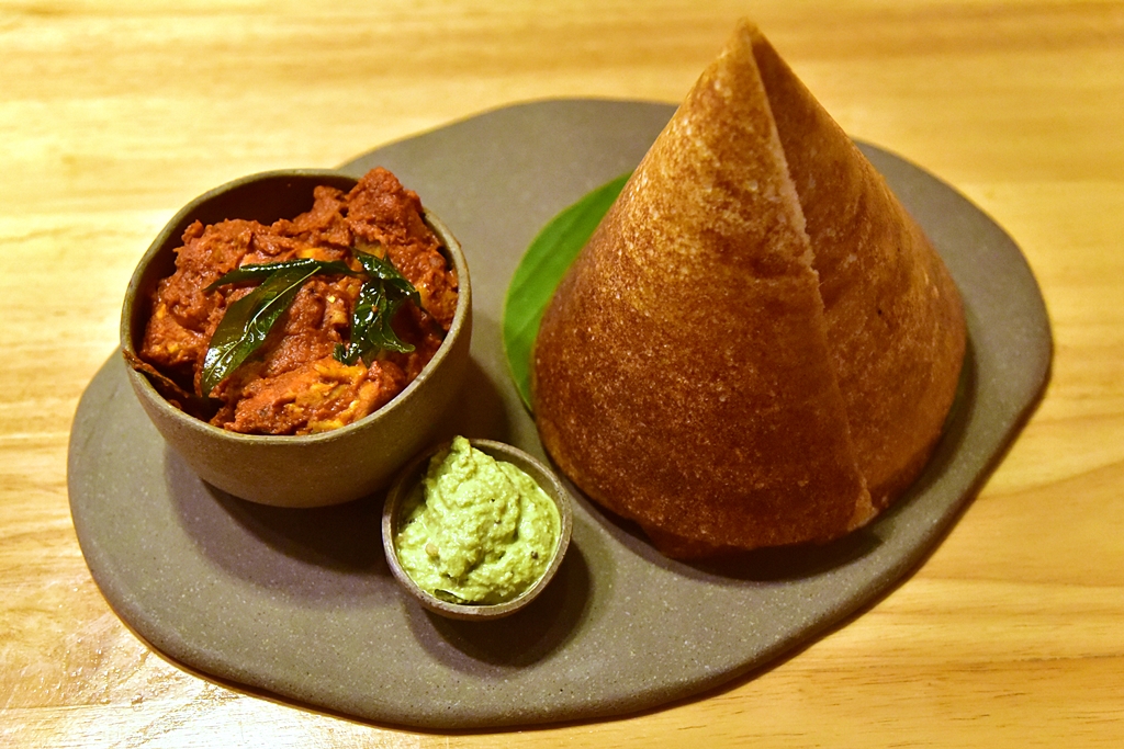 7. Ghee Roast Chicken, kundapur red masala, crispy cone dosa (520++ THB) [14/20] – แกงเนื้อไก่แห้งปรุงรสด้วยเครื่องเทศสีแดงเข้มข้นเสิร์ฟคู่กับแผ่นแป้งโดซ่าชิ้นใหญ่และชัทนีย์มะพร้าว