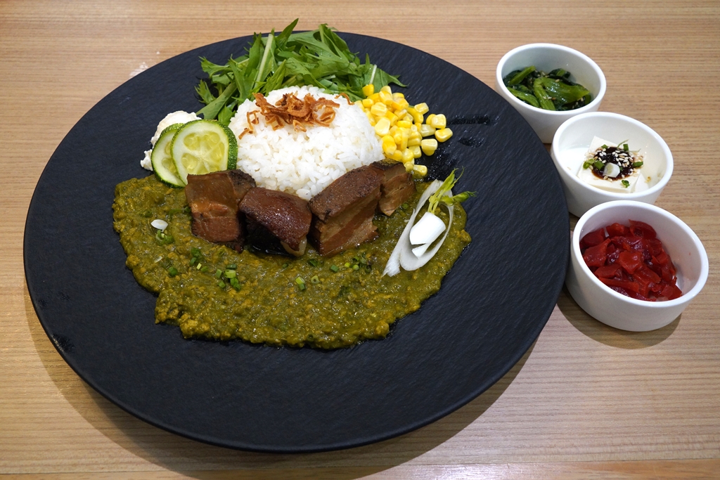 3. Matcha Curry Rice (390+ THB) [14/20] – ข้าวแกงกะหรี่หมูสามชั้นตุ๋นที่ตัวแกงกะหรี่มีส่วนผสมของเนื้อสับและมัตฉะเสิร์ฟคู่กับเต้าหู้เย็น ผักดองและผักต้ม