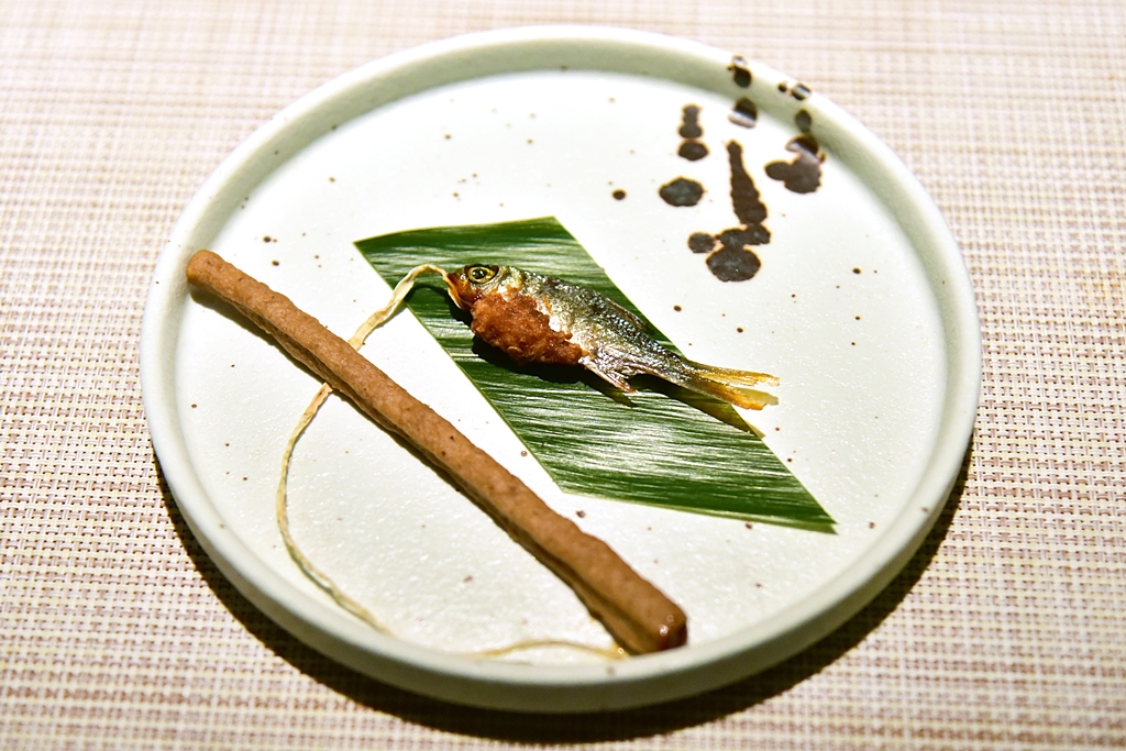 1st course: Java Barb, Dehydrated Papaya, Ficelle – ปลาตะเพียนเล็กยัดไส้ซอสต้มยำทอดกรอบเสิร์ฟมาพร้อมกับเบ็ดตกปลาปลอมที่ทำจากมะละกอตากแห้งและขนมปังกรอบสไตล์ฝรั่งเศส