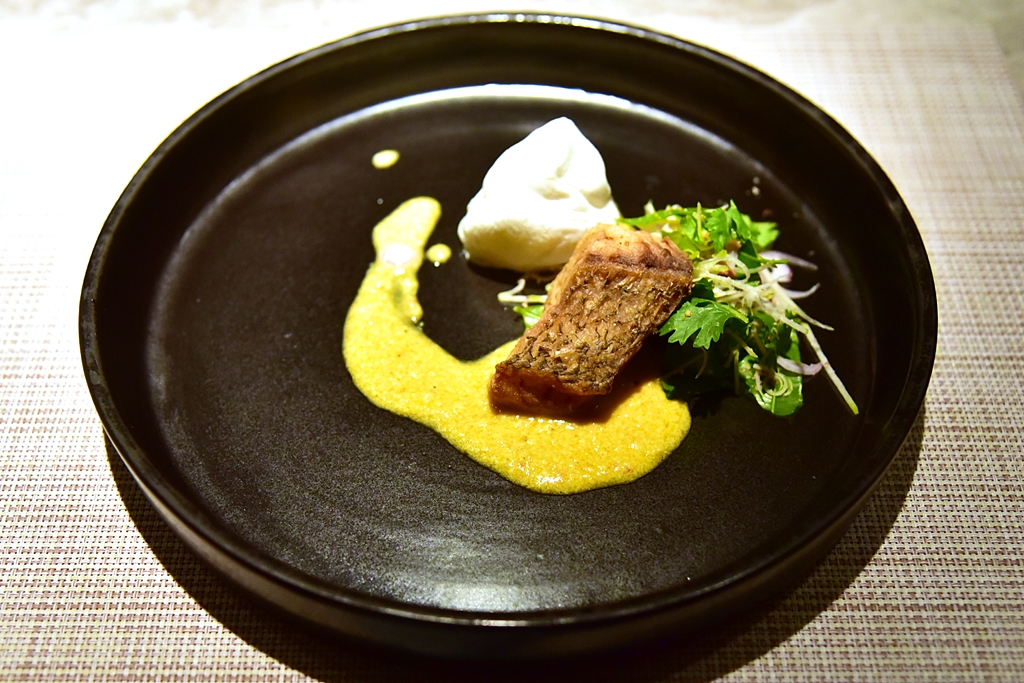 10th course: Jonh’s Snapper, Bouget Meringue – เนื้อปลาอังเกยทอดเสิร์ฟคู่กับเมอแรงค์น้ำปลาหวาน ยำผักสมุนไพรและซอสแกงเหลือง ทุกอย่างเข้ากันได้อย่างลงตัวมาก