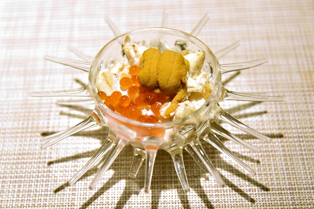 11th course: Kani Donburi, Uni, Ikura, Duck Yolk Snow – ข้าวหน้าเนื้อกรรเชียงปูม้าผัดเนยเสิร์ฟคู่กับมันปูน้ำจิ้มซีฟู้ด อูนิ ไข่ปลาแซลม่อนดองและหิมะซอสไข่เป็ดแดง เมนูนี้คือโคตรไฮไลต์ที่อัดแน่นไปด้วยวัตถุดิบชั้นเยี่ยม ดีงาม
