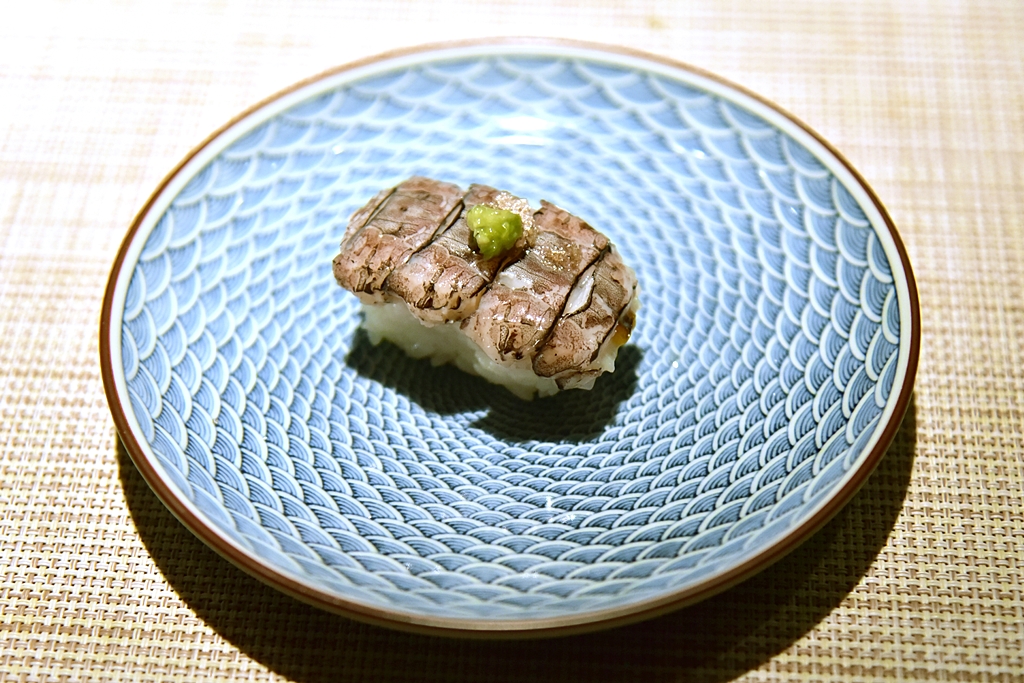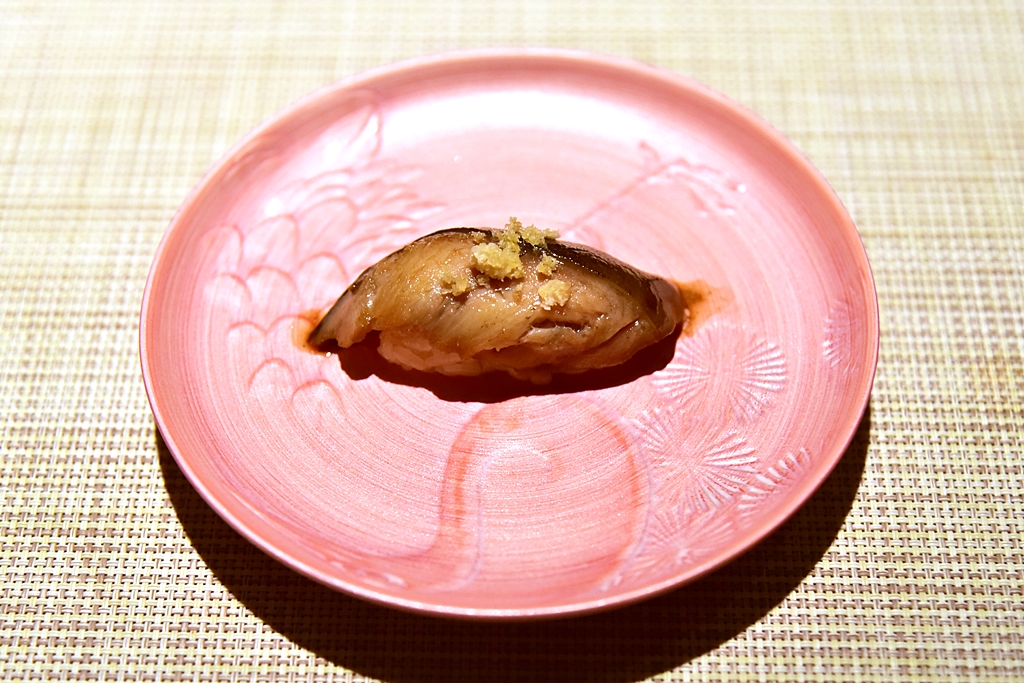 6th course: Namazu, Kabayaki – ซูชิหน้าปลาดุกที่ผ่านการซูวีด์จนเนื้อนุ่มเสิร์ฟในรูปแบบเดียวกับซูชิปลาไหลย่างโรยหน้าด้วยปลาดุกฟู