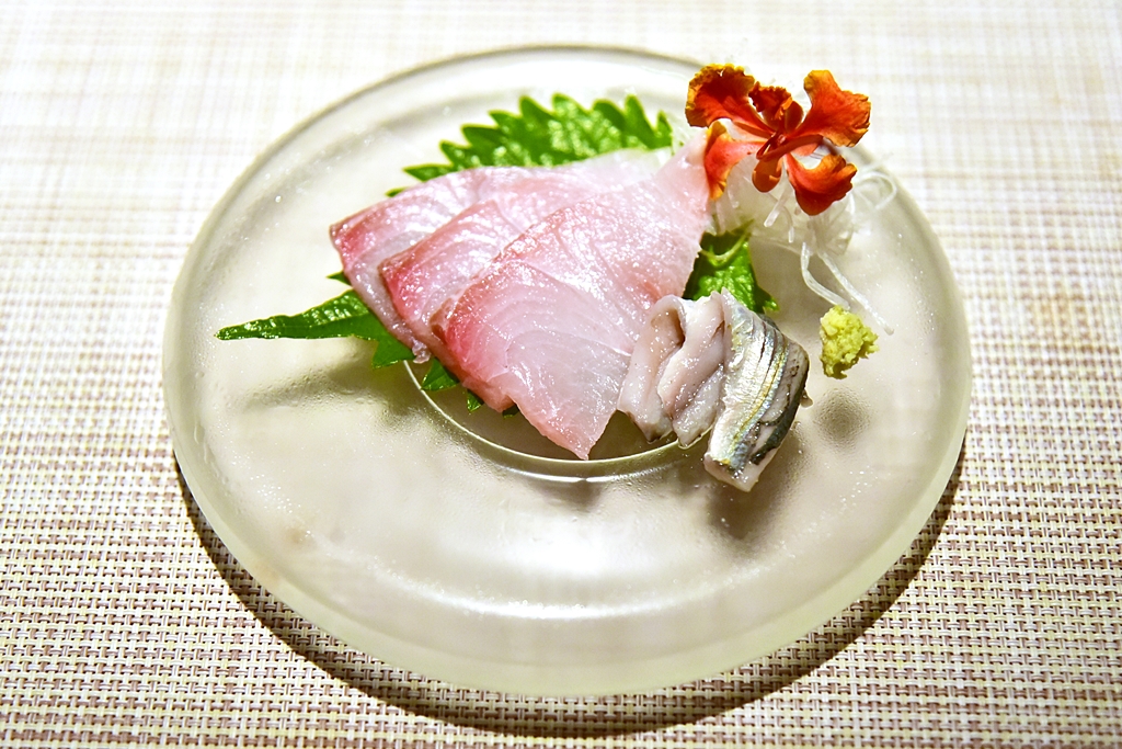 4th course: Shime Kohada & Cobia, Sashimi – ซาชิมิปลาช่อนทะเลและปลากุแลหลังเขียวที่ผ่านการเตรียมวัตถุดิบในแบบญี่ปุ่นแท้ๆเสิร์ฟคู่กับโชยุรสเยี่ยมและมะระดองที่ใช้แทนขิงดอง น่าเสียดายที่ตัวปลายังมีกลิ่นคาวอยู่ แต่รสสัมผัสถือว่าดี