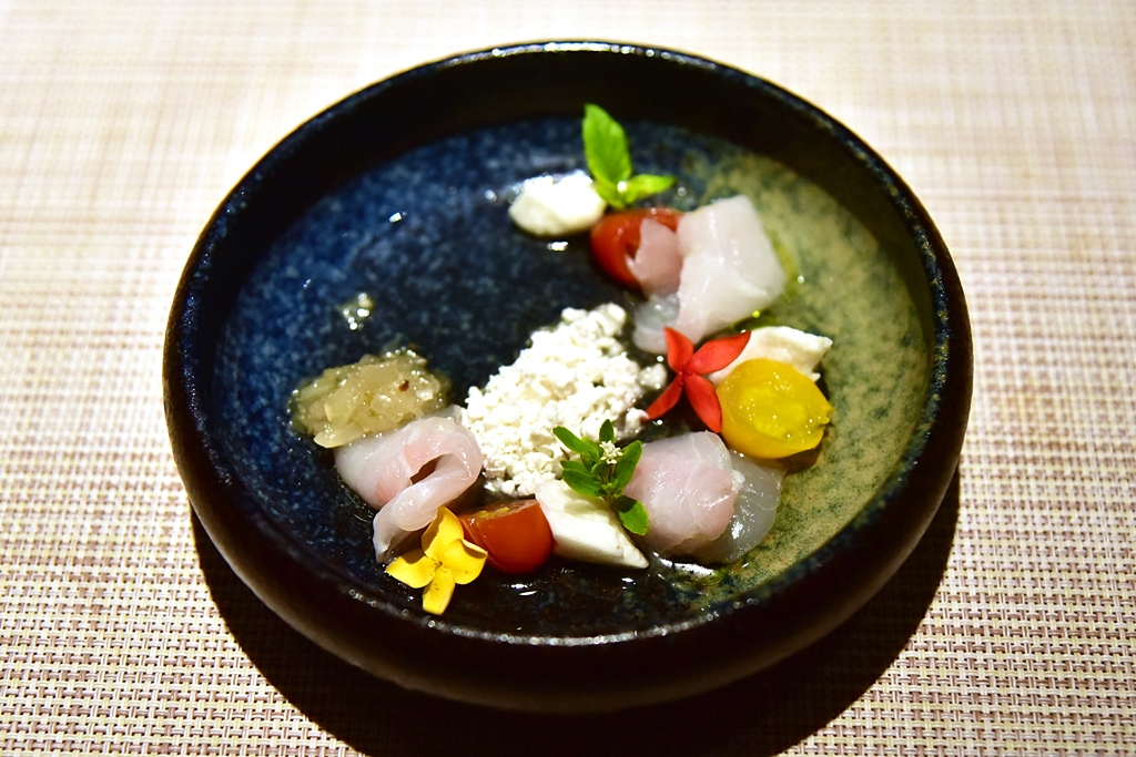3rd course: Sweetlip, Ceviche – เนื้อปลาสร้อยนกเขาเสิร์ฟแบบ “เซวิชเช่” คู่กับน้ำยำสไตล์สเปนในรูปเกล็ดหิมะ
