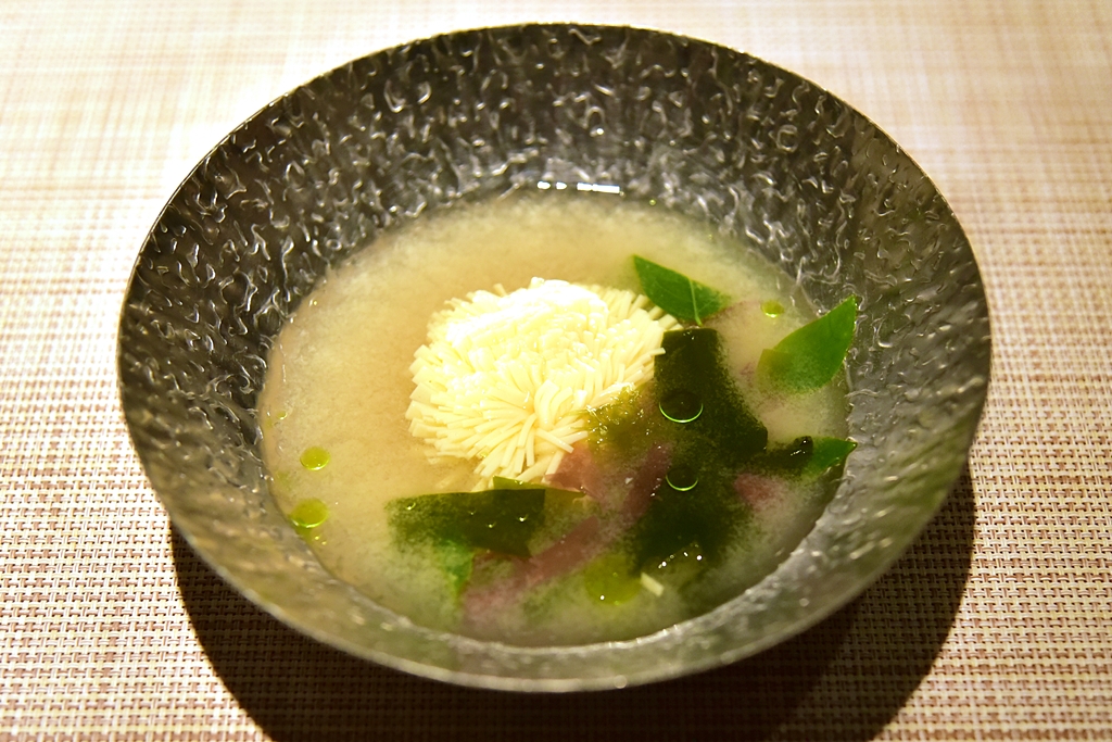 12th course: Tom Klong Miso Soup, Tofu Wakame – ซุปมิโสะต้มโคล้งเสิร์ฟคู่กับเต้าหู้และสาหร่าย