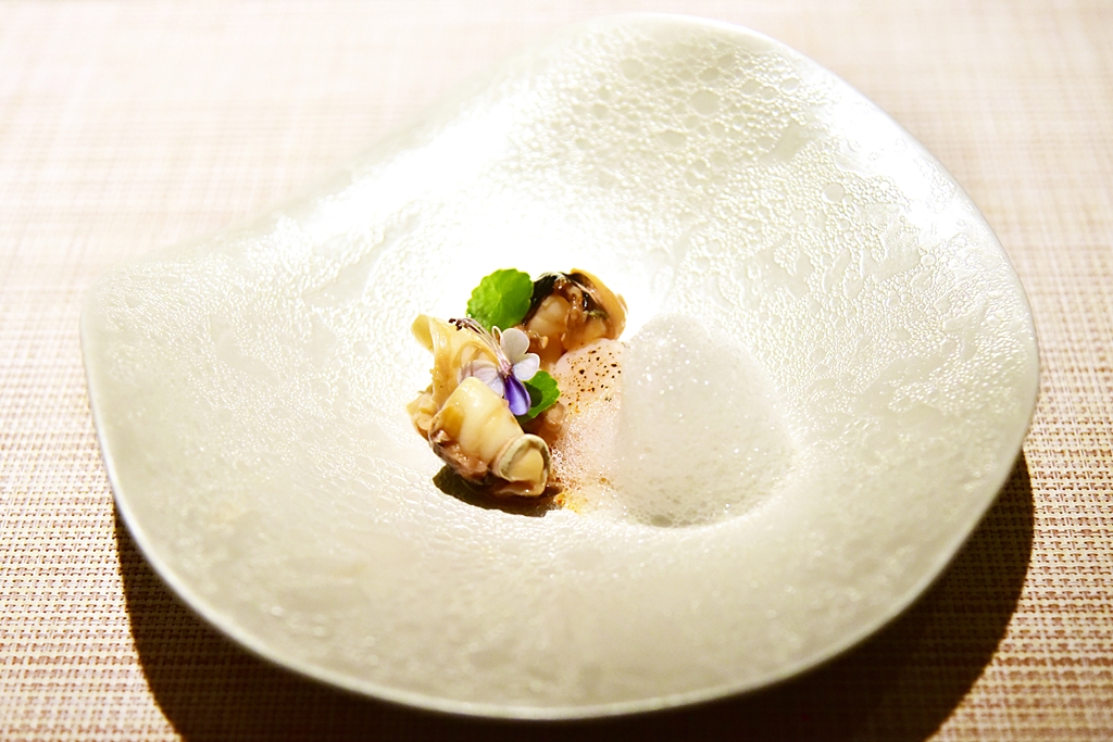 9th course: Wing Shell, Goma Ae – หอยชักตีนเนื้อนุ่มที่เสิร์ฟมาได้แบบพรีเมี่ยมสุดๆคู่กับน้ำยิ้มและฟองซอสงาบดที่เข้ากันได้ดีมาก