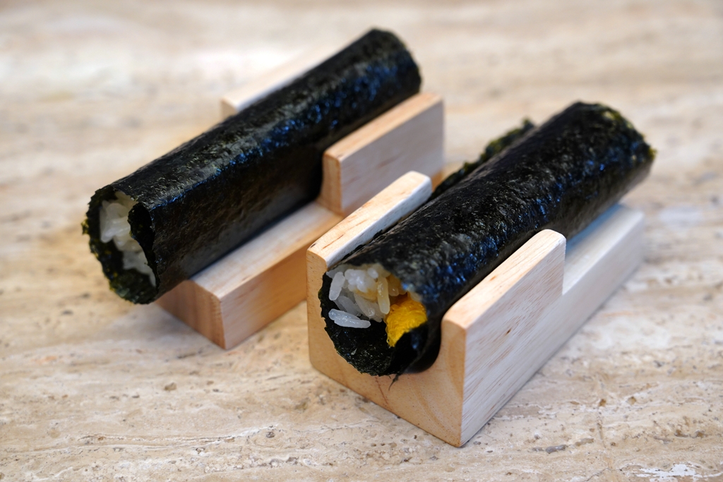 2. Uni Temaki (230 THB) [15/20] – “ปั้นข้าว“ แฮนด์โรลข้าวซูชิรสหวานจากข้าวเหนียวมูนเสิร์ฟกับ “อูนิ” ปลอมที่ทำจากไข่หวานราดโชยุกับวาซาบิ ถือเป็นเมนูแฮนด์โรลของคาวผสมของหวานที่อร่อยลงตัว