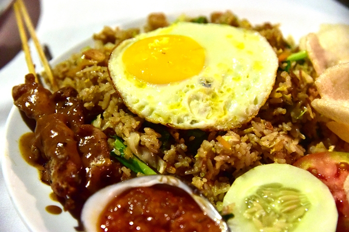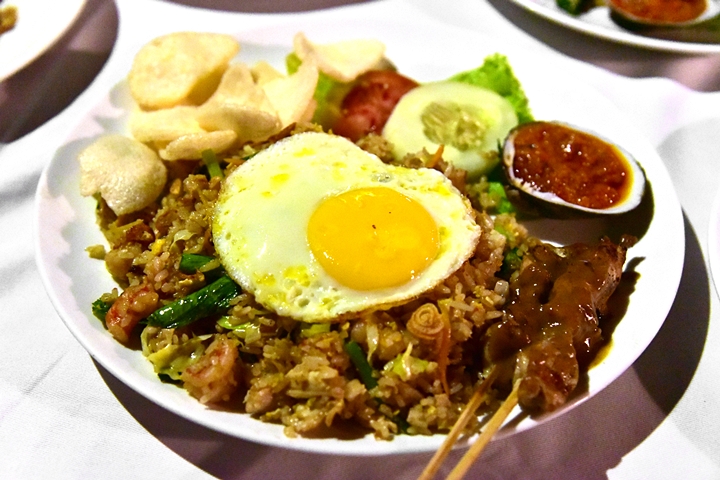 5. Nasi Goreng (Rp. 75.000) – ข้าวผัดนาซีโกเรงรสเข้มข้นหน้าไข่ดาวเสิร์ฟคู่กับสะเต้ะเนื้อแพะ