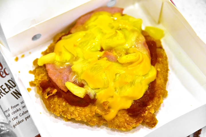 เมนูอาหารของ KFC Singapore นั้นโดยรวมก็จะคล้ายๆกับ KFC ในประเทศไทยครับ มีทั้งไก่ทอด เฟรนช์ฟรายส์ เบอเกอร์ ไรซ์โบวล์ (เปลี่ยนจากข้าวยำไก่แซ่บเป็นข้าวแกงกะหรี่ไก่ทอด) และก็เมนูใหม่ที่กำลังโปรโมทอย่าง Chizza พิซซ่าไก่ทอดที่แตกต่างจากของเวอร์ชั่นในไทยพอสมควรตรงที่ Chizza ของสิงคโปร์มีสับปะรดบนเนื้อไก่ด้วย นี่มันฮาวายเอี้ยนชัดๆ !! ส่วนเมนูไก่ทอดที่ผมได้ชิมไปนั้นรสชาติใกล้เคียงกับไก่ทอดฮอตแอนด์สไปซี่ของไทยเลย แต่ที่ไม่ชอบเลยคือ ซอสพริกที่รสชาติจะออกหวานๆและมีกลิ่นแปลกๆที่ไม่ถูกใจผมเท่าไหร่ ฮ่าๆ