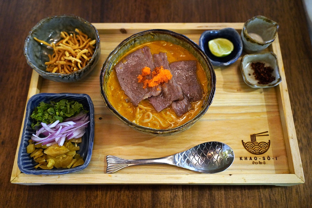 1. ข้าวซอยเส้นสดเนื้อ AUS Tajima Wagyu (239 THB) [15/20] – ข้าวซอยเส้นสดเสิร์ฟในแนวเดียวกับราเมนคู่กับเนื้อทาจิมะวากิวออสเตรเลียย่างไฟและไข่กุ้ง ตัวเส้นจะหนึบๆเคี้ยวสนุกกว่าร้านข้าวซอยทั่วไป ตัวซุปจะเน้นข้นๆมันๆหอมเครื่องที่สามารถเติมรสชาติได้ตามชอบ