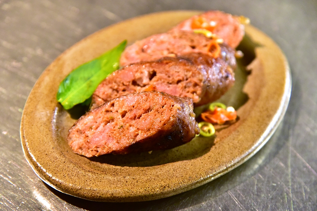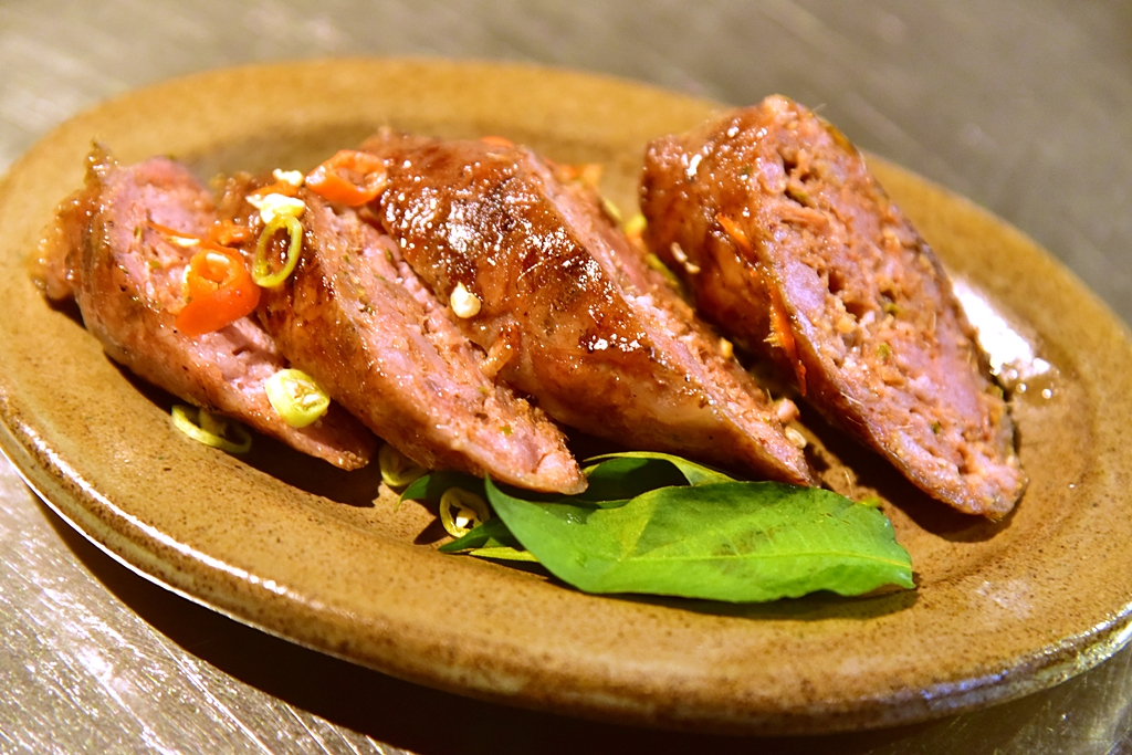 3. Isaan Style Tamworth Sausage (5.00 GBP) – ไส้กรอกอีสานรสชาติเข้มข้นเสิร์ฟคู่กับพริกสดและใบมิ้นต์