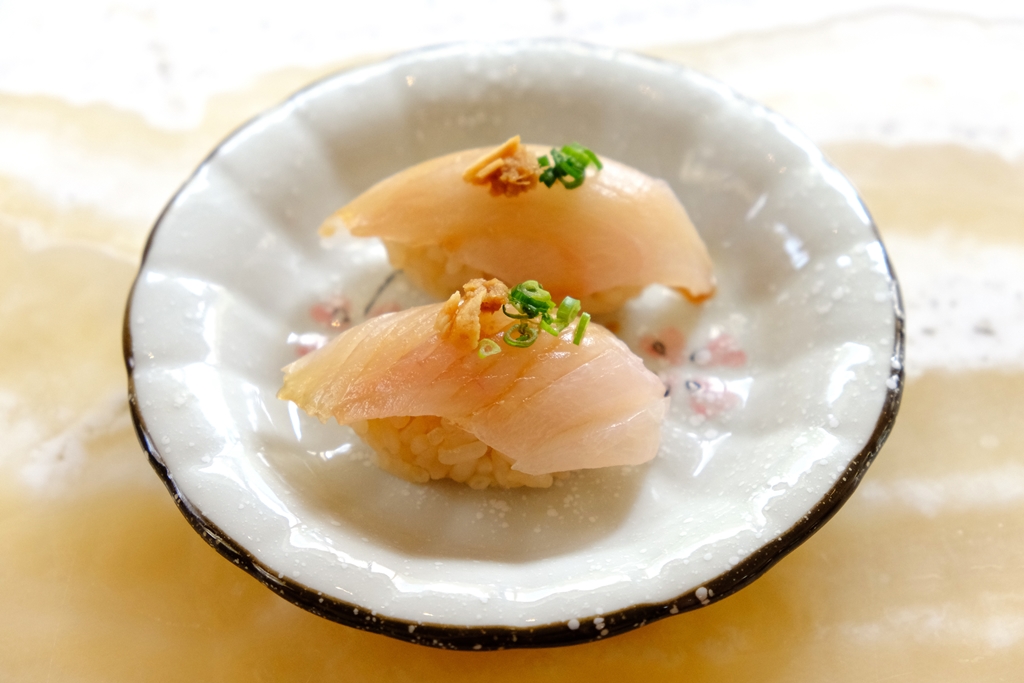 4. Shima Aji Nigiri (320++ THB) [15/20] – ซูชิหน้าเนื้อปลาชิมะอาจิเนื้อกรึบหยุ่นที่สามารถเลือกสั่งเป็นคำๆได้