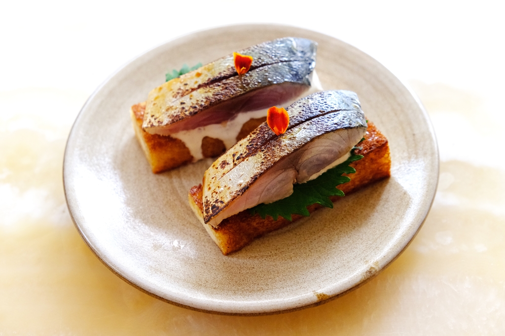 2. Saba Toast Wasabi Sour Cream (520++ THB) [17/20] – ปลาซาบะดองชิ้นโตเสิร์ฟบนขนมปังบริออชปิ้งเนื้อเบากรอบกับซาวร์ครีมวาซาบิและใบชิโสะ