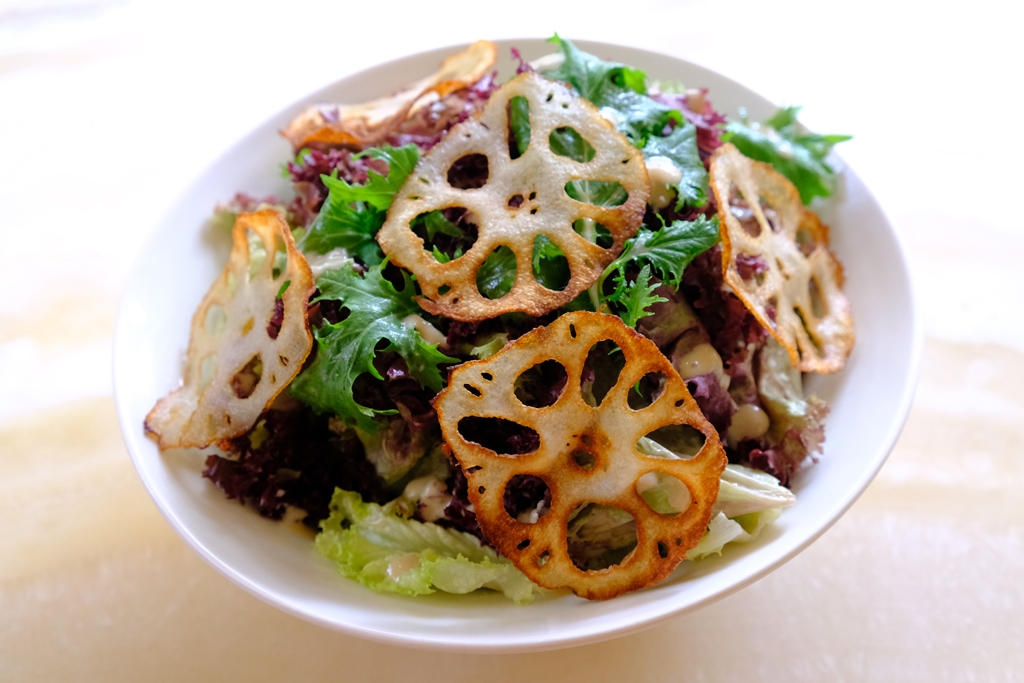 5. Sauteed Mushroom Salad with Crispy Lotus (250++ THB) [14/20] – สลัดเห็ดผัดและรากบัวกรอบราดน้ำสลัดเต้าหู้และขิง