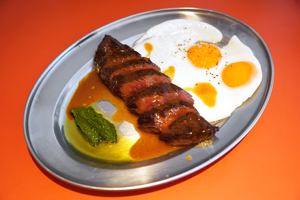 3. Steak & Eggs (850++ THB) [16/20] – สเต็กเนื้อวากิวส่วน flank ที่เนื้อแดงเน้นๆเคี้ยวเพลินเสิร์ฟคู่กับไข่ดาวสองฟองและซอสซัลซ่าเขียว