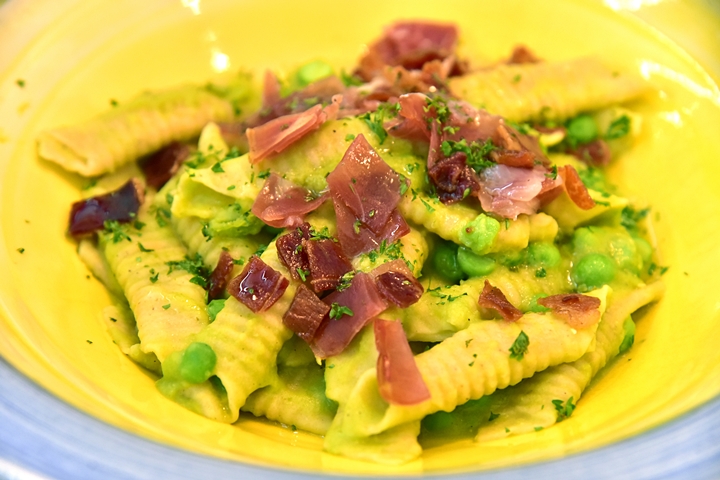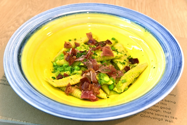 2. Garganelli (360+ THB) – พาสต้าเส้นม้วนเนื้อนุ่มๆในซอสถั่วกรีนพีและปาร์ม่าแฮมบ่ม 24 ชั่วโมง