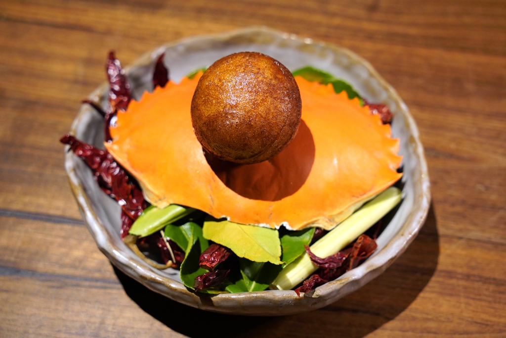 4th course : CHILI CRAB 11.0 | SNOW CRAB [18/20] – เมนู “ปูผัดพริก” ชื่อดังของสิงคโปร์ที่ถูกนำมาตีความใหม่มาทุกๆปีเป็นรอบที่ 11 ตั้งแต่ปี 2014 โดยคราวนี้เสิร์ฟเป็นไอศกรีมแกงปูผัดพริกผสมเนื้อมะเขือเทศกับเนื้อปูหิมะและดอกไม้ที่รสชาติเหมือนมะม่วงดิบท็อปด้วยบิสกิตรูปปูคู่กับหมั่นโถวทอดสอดไส้แกงปูผัดพริกอุ่นๆ