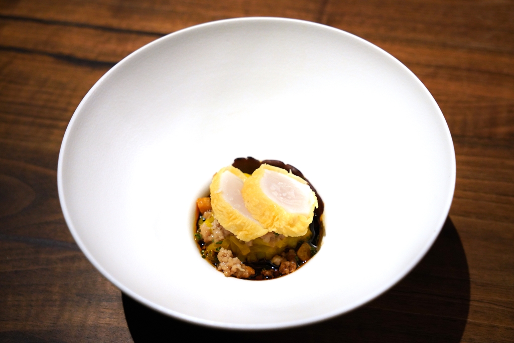 5th course : BAK CHOR MEE | AORI IKA [17/20] – บะหมี่หมูสับลูกชิ้นปลาสูตรแบบปรับโฉมใหม่โดยเส้นบะหมี่ทำมาจากปลาหมึกอาโอริอิกะเนื้อหยุ่นๆเสิร์ฟคู่กับหอยเชลล์เทมปุระที่ทำหน้าตาออกมาคล้ายๆกับลูกชิ้นปลาคลุกเคล้าด้วยซอสซีอิ๊วหมูสับรสกลมกล่อมเผ็ดนิดๆ