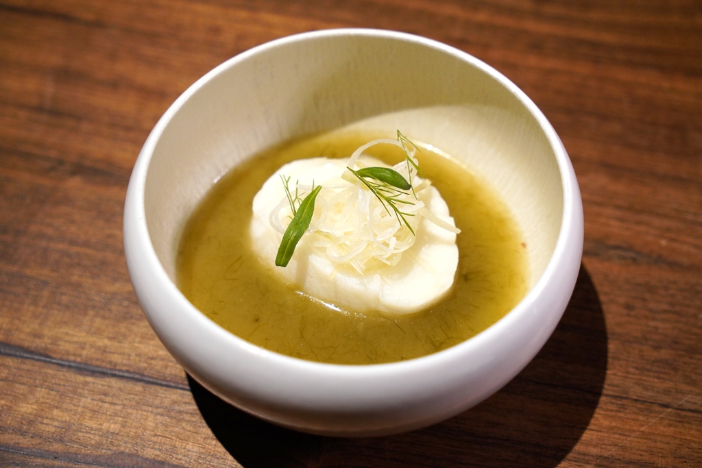 6th course : FISH MILK SOUP | PATAGONIAN TOOTH FISH [16/20] – ซุป “นมปลา” ที่ทำจากการเคี่ยวเนื้อปลากับกระดูกปลานานกว่า 3 วันจนได้น้ำซุปข้นๆสีขาวเหมือนนมเสิร์ฟคู่กับเนื้อปลาหิมะเด้งๆชิ้นโตและก๋วยเตี๋ยวเส้นปลา