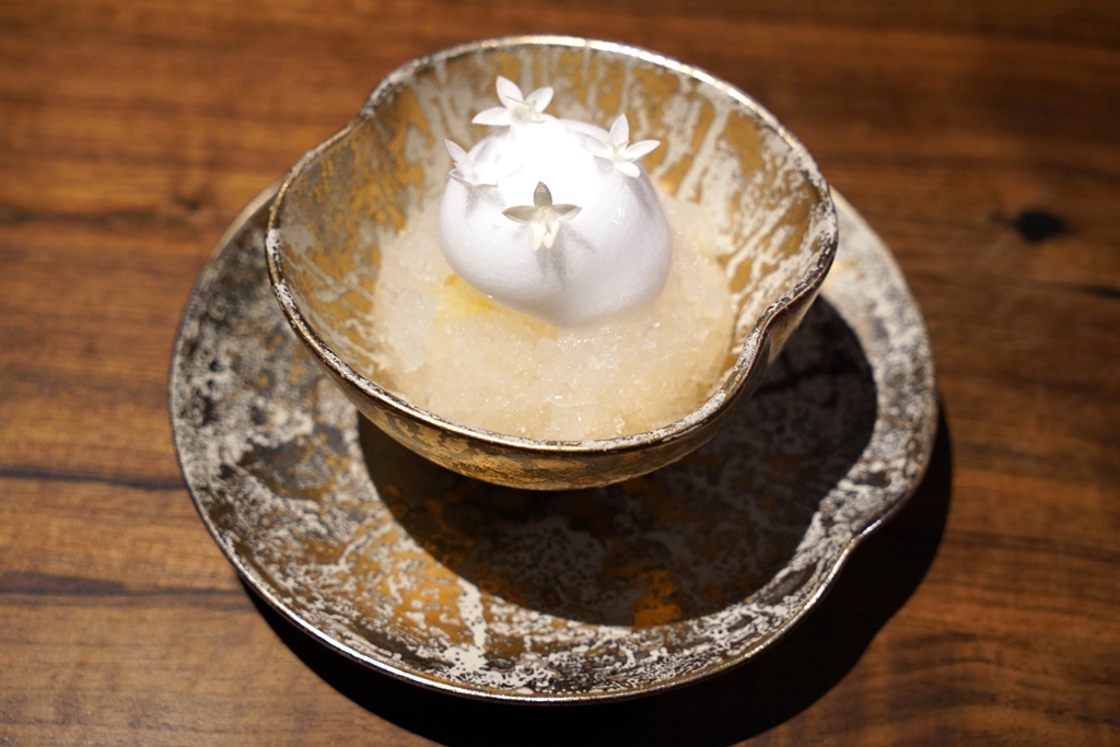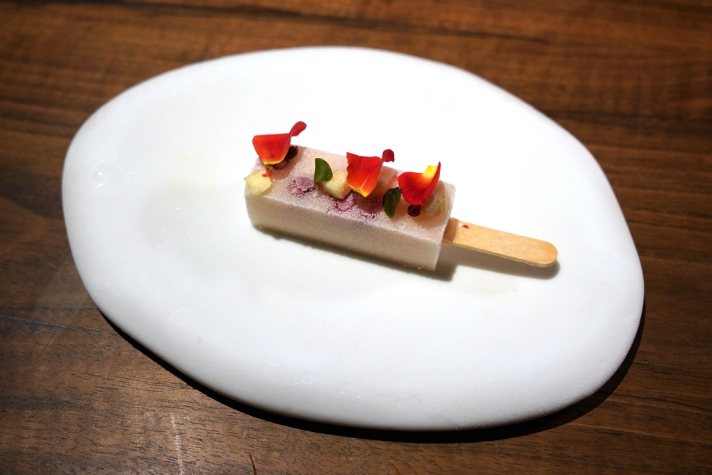 7th course : POTONG | GINGERFLOWER [15/20] – ไอติมตัดรสดอกดาหลาที่เติมความอร่อยด้วยพริกไทยสีชมพู ดอกกุหลาบและสับปะรดแห้ง เมนูนี้เป็นการล้างปากก่อนเข้าเมนคอร์ส