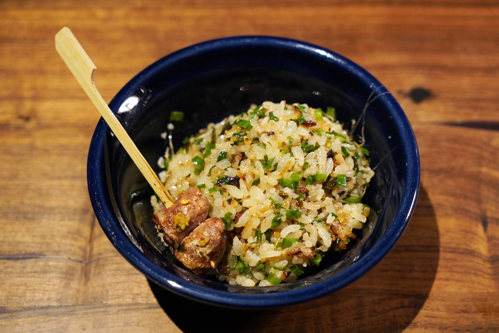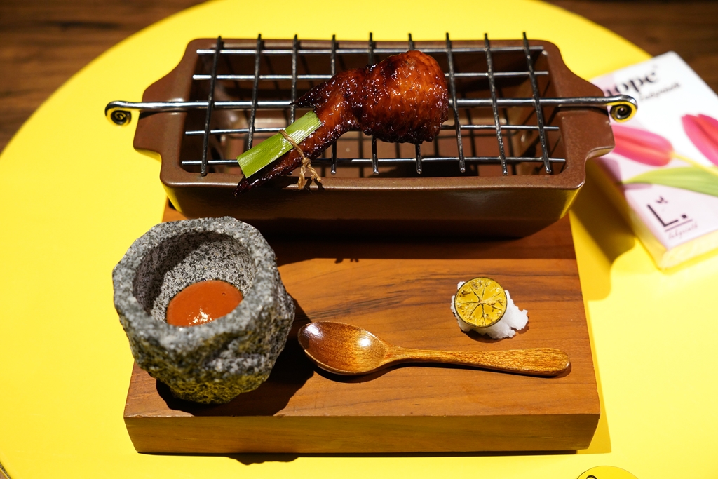 8th course : HAINANESE CHICKEN RICE DONABE | LOCAL POULET [18/20] – “ข้าวมันไก่ไห่หนาน“ แบบไม่ธรรมดาที่เริ่มจากข้าวมันไก่อบหม้อดินกับต้นหอมจนหอมกรุ่นเสิร์ฟคู่กับหัวใจไก่เสียบไม้ปิ้งและเนื้อไก่ที่ทำออกมาสองแบบในชิ้นเดียวคู่กับซอสน้ำจิ้มไก่ อาจาด ซอสพริกและต้นหอม ตบท้ายด้วยซุปเต้าหู้รสกลมกล่อม