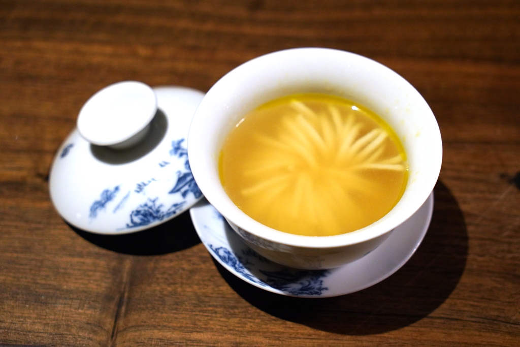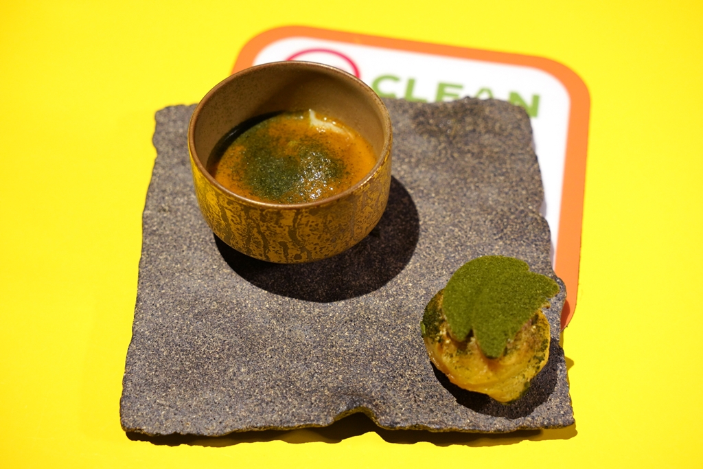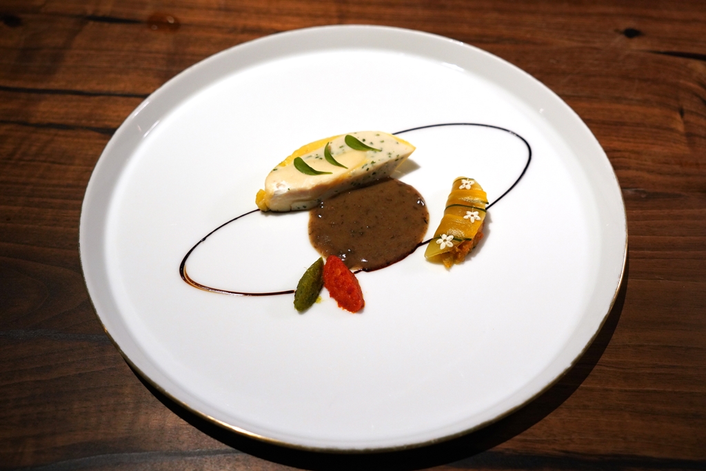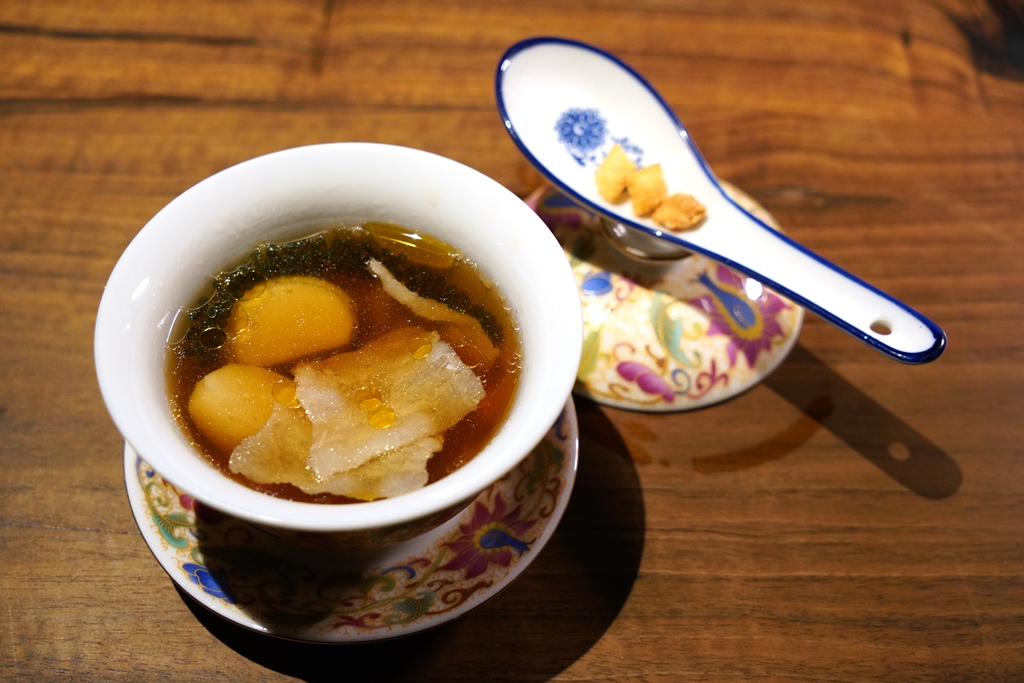3rd course : BAK KUT TEH | CHAWANMUSHI [19/20] – “บักกุตเต๋” ที่ด้านล่างเป็นไข่ตุ๋นเนื้อเนียนท็อปด้วยซุปบักกุตเต๋รสกลมกล่อมเสิร์ฟคู่กับกระเทียมปลอมไส้ครีมกระเทียม หมูสามชั้นสไลด์บาง สาหร่ายพวงองุ่นและน้ำมันพริกไทย ทานคู่กับปาท่องโก๋กรอบจิ๋ว เมนูนี้คือโคตรอร่อยและสร้างสรรค์มากๆ