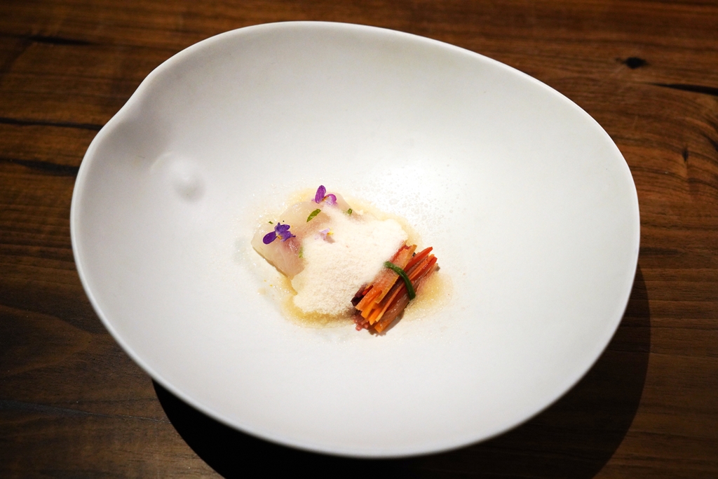 2nd course : RAINBOW YUSHENG | SHIMA AJI [17/20] – ซาชิมิปลาชิมะอาจิเนื้อกรอบเด้งถูกต้องเสิร์ฟคู่กับผักดองหลากชนิดและน้ำยำมะกรูดน้ำผึ้งหิมะเย็นจัด รสชาติแบบยำปลาดิบอร่อยลงตัว