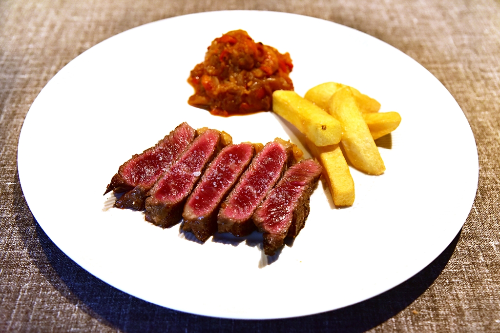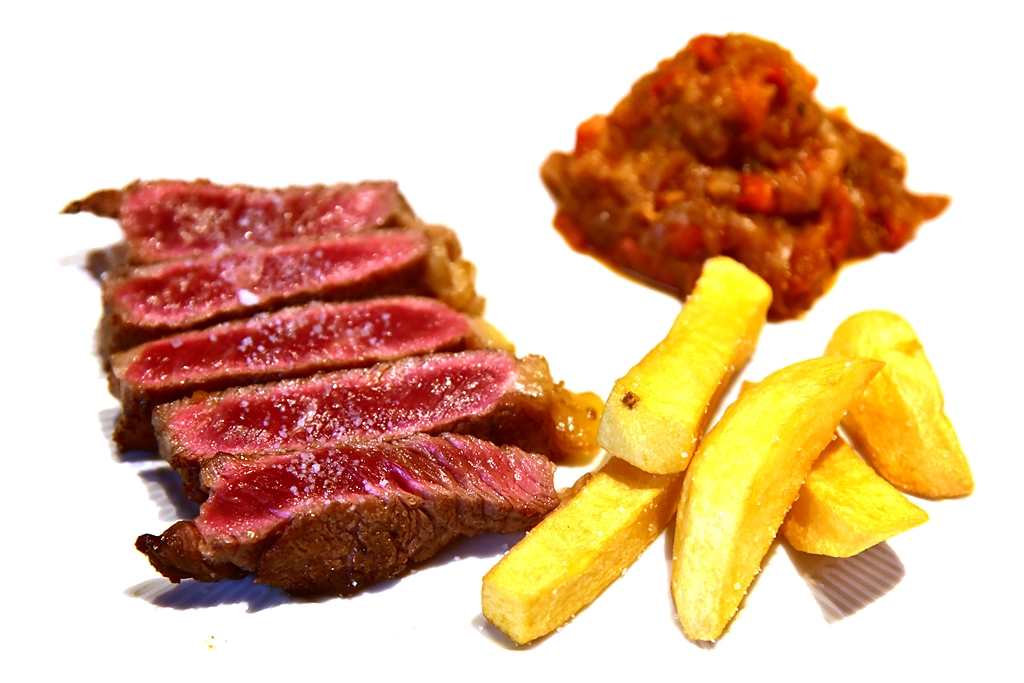 6. Grilled Steak with Organic Vegetables and Fried Potatoes (15.00 EURO) – สเต็กเนื้อย่างได้อย่างดีเยี่ยมปรุงรสด้วยเกลือเสิร์ฟคู่กับเฟรนช์ฟรายส์และสตูว์ผักออร์กานิค