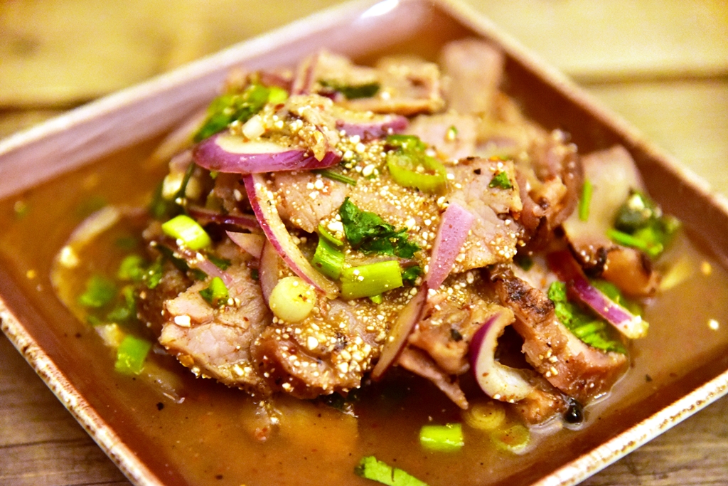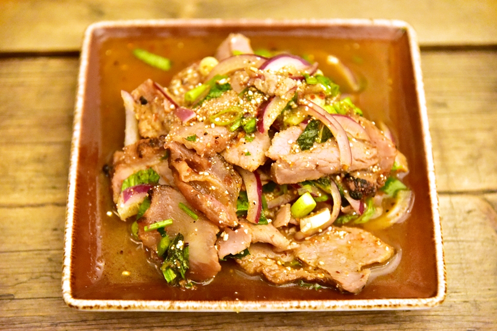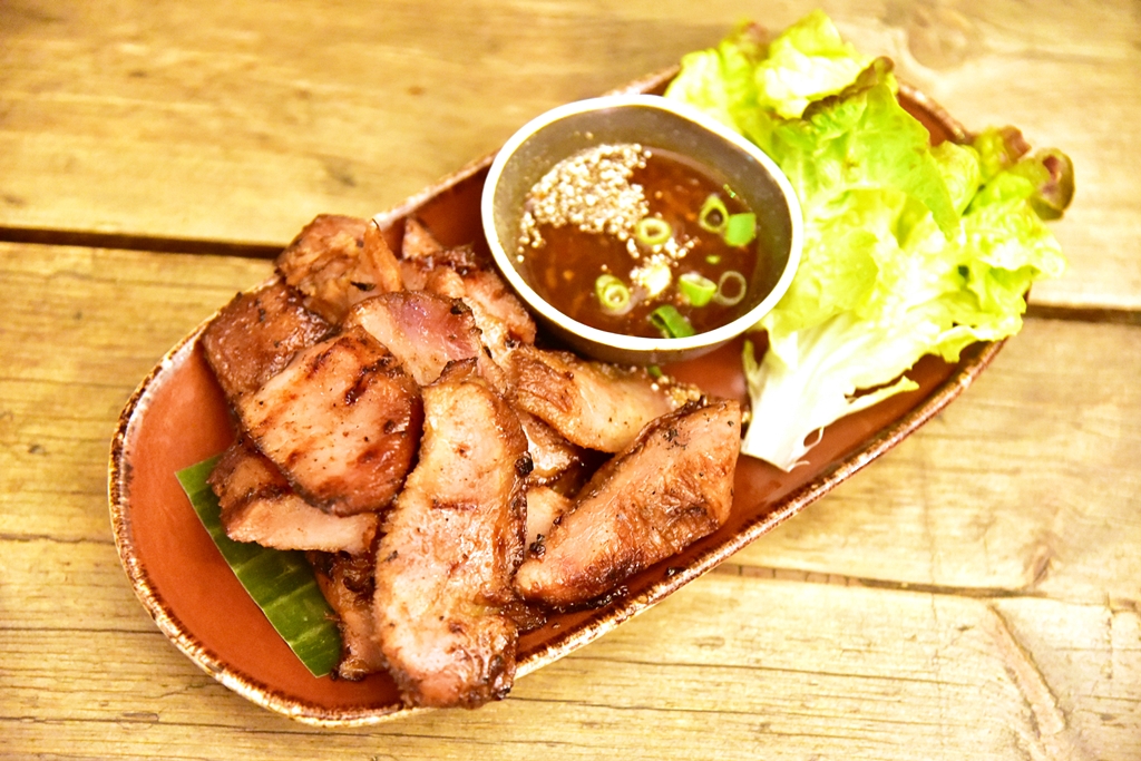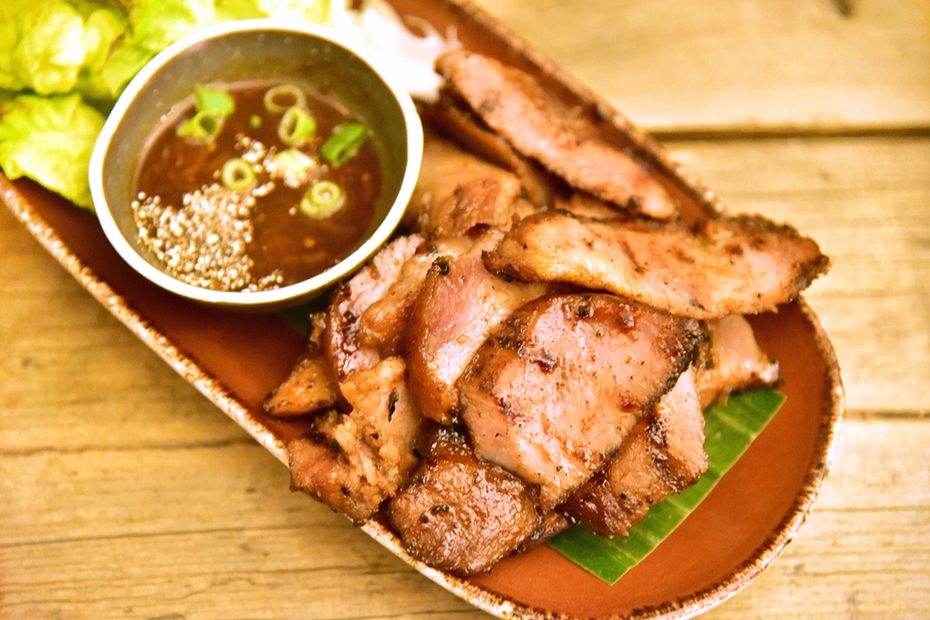 1. Jee Kor Moo (10+ GBP) – จี่คอหมูเนื้อนุ่มที่หมักมาอย่างถึงเครื่องย่างจนหอมกรุ่นทานคู่กับแจ่วรสหวานกลมกล่อม สั้นๆครับ “อร่อยเหาะ”
