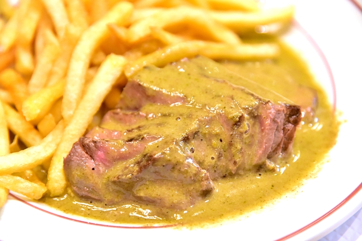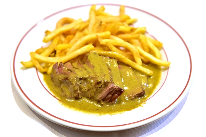โดยร้านอาหารที่ขึ้นชื่อว่าเป็นเบอร์หนึ่งและจุดกำเนิดของเมนู Steak-Frites ก็คือร้าน Le Relais De Venise หรือ “ร้านสเต็กเนื้อต่อคิว” ที่ทั้งหมดในร้านนั้นจะเสิร์ฟเมนูอาหารคาวเพียงเมนูเดียว !! นั่นก็คือสเต็กกับเฟรนช์ฟรายส์ที่สามารถเลือกระดับความสุกได้ พร้อมด้วยเครื่องอย่างสลัดวอลนัทและขนมปังอบ (ร้านอาหารประเภทนี้จะถูกเรียกว่า L’Entrecôte)