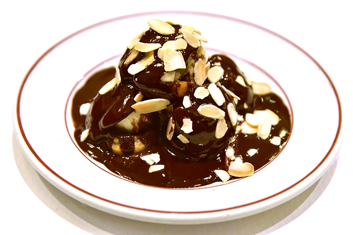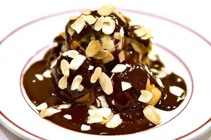 3. Les Profiteroles au Chocolat (5.95+ GBP) – ชูครีมลูกเล็กสอดไส้ไอศกรีมวานิลลาราดซอสช็อกโกแลตรสเข้มข้น