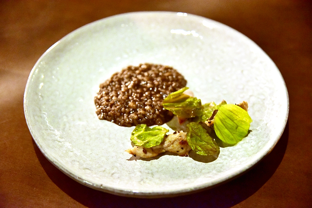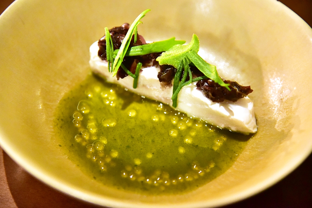 10th course: Turbot, pickled seaweed, tapioca – เนื้อปลาเทอร์บอตสีขาวเนียนนุ่มเสิร์ฟคู่กับซอสสาหร่าย สาหร่ายหลากชนิดและเม็ดแป้งมันสัมปะหลัง เมนูนี้ดีงามที่สุดในมื้อเลยครับ