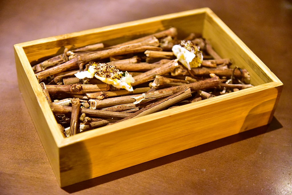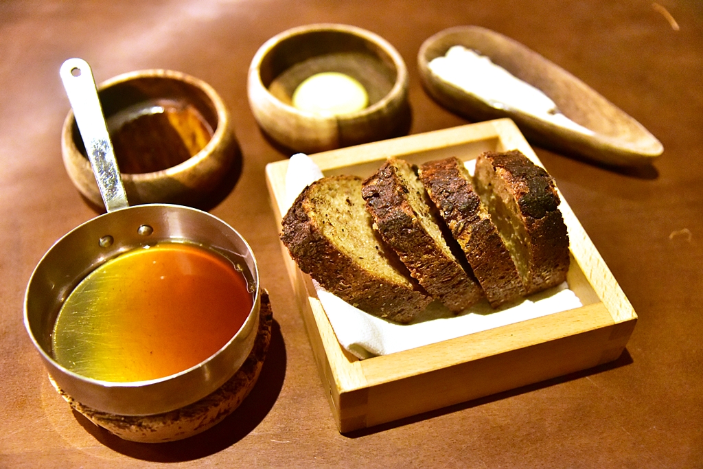 8th course: Sourdough Bread, steak sauce, fish bone emulsion, olive oil, coffee butter – ขนมปังซอร์โดเสิร์ฟคู่กับเครื่องเคียงสี่อย่างทั้งซอสสเต็ก ซอสกระดูกปลา น้ำมันมะกอกอย่างดีและเนยกลิ่นกาแฟ