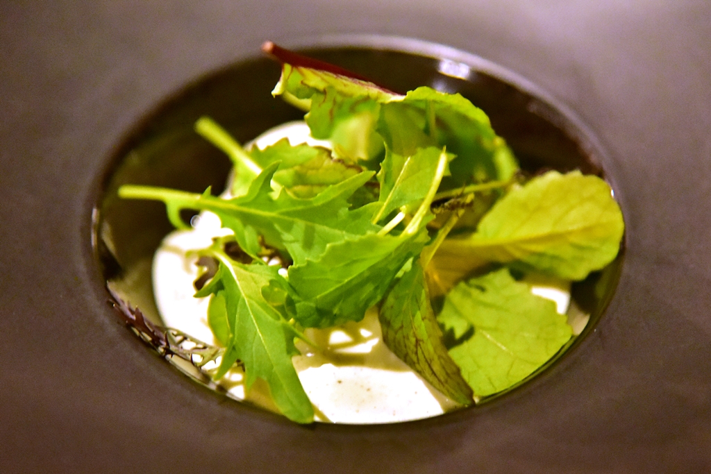 11th course: Confit Cod Fish, black garlic – เนื้อปลาค้อดเสิร์ฟในซอสครีมรสเข้มข้นพร้อมกับกระเทียมดำและผักสลัด