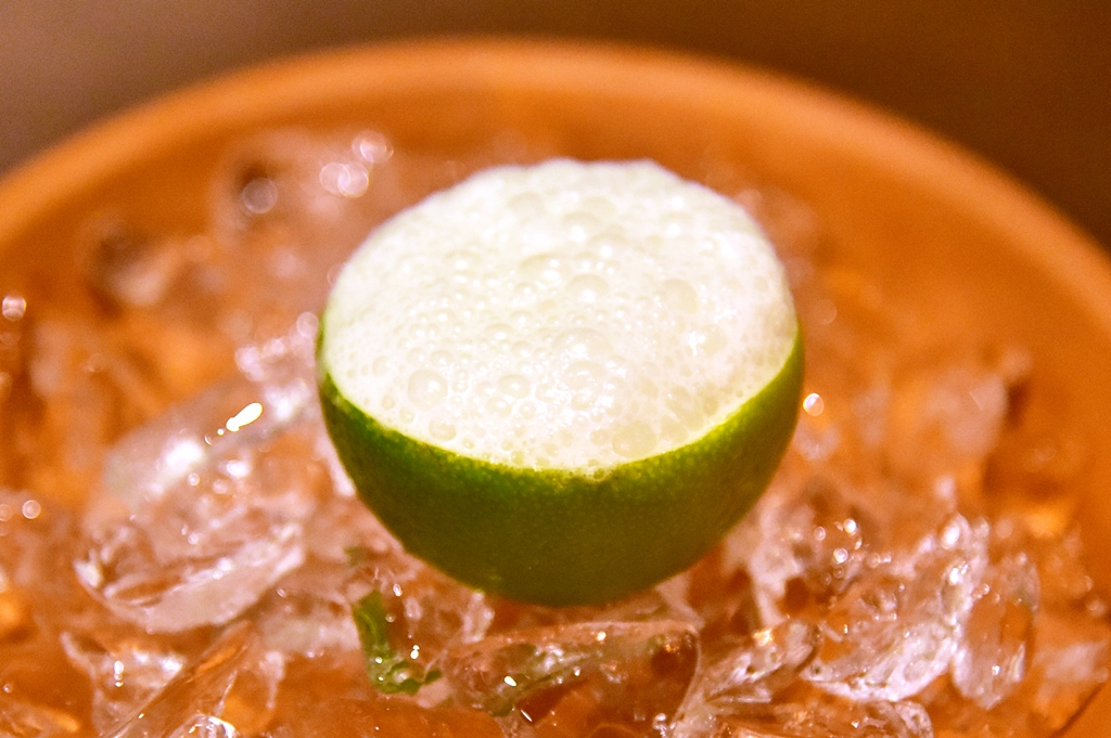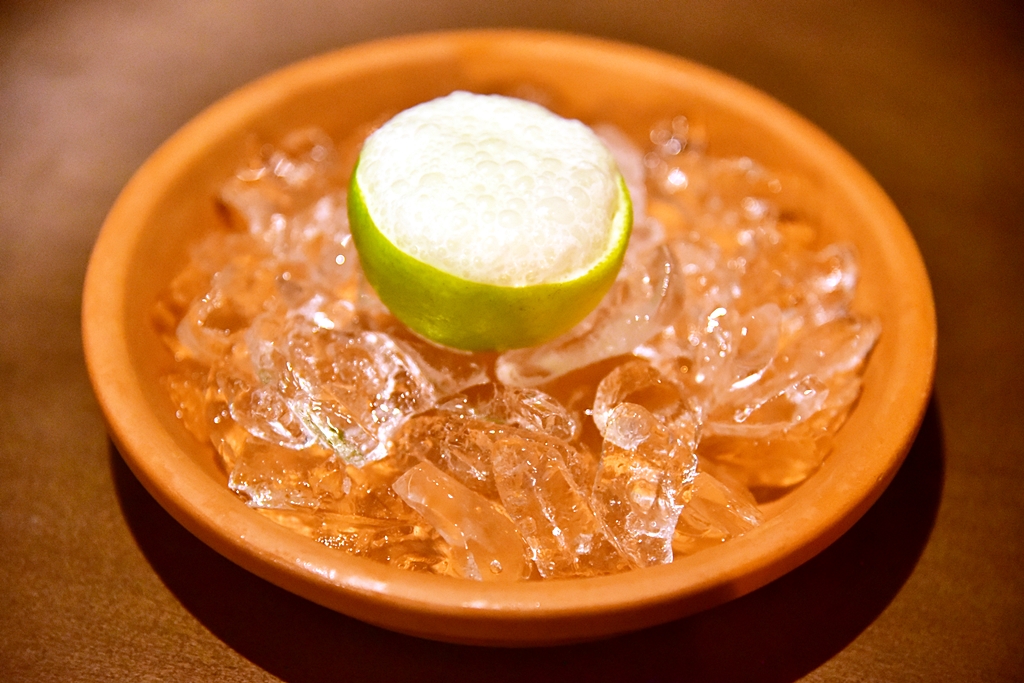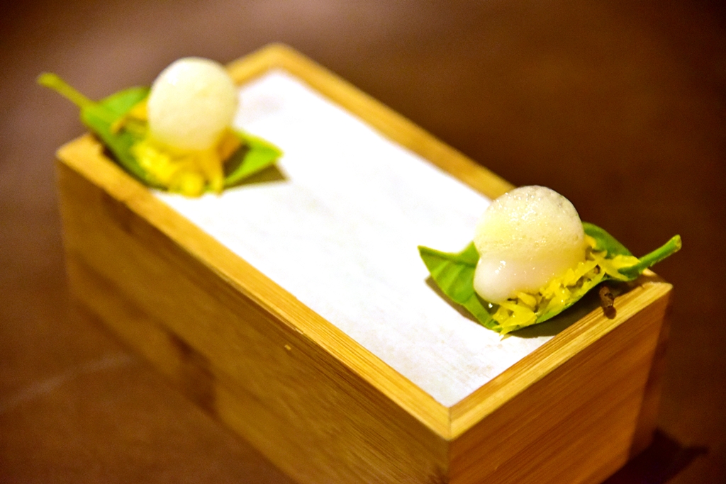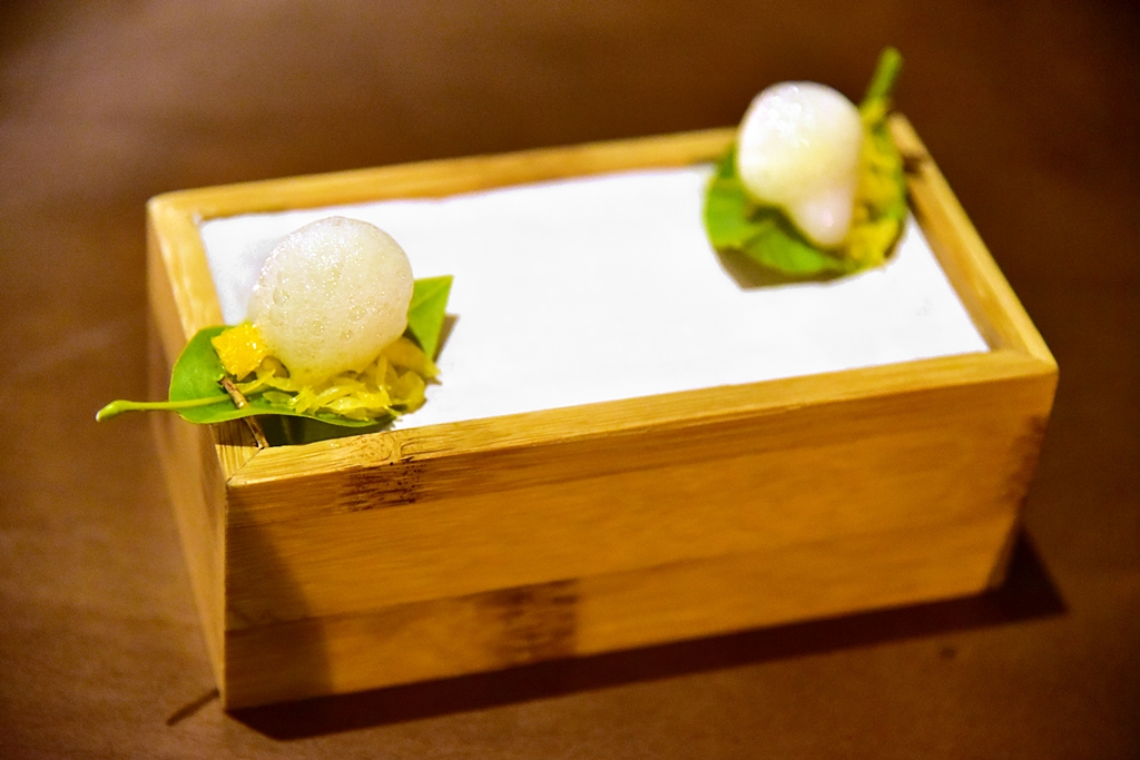 2nd course: Oyster, green apple, coconut, lime – หอยนางลมสดเสิร์ฟพร้อมกับแอปเปิ้ลเขียวและโฟมมะพร้าวในลูกมะนาว ที่ต้องบีบให้น้ำมะนาวรสเปรี้ยวไหลผสมเข้ากับตัวหอยนางรมก่อนทานครับ สดชื่นมาก
