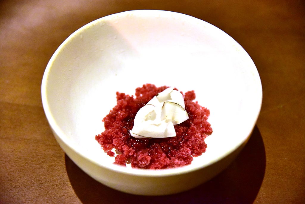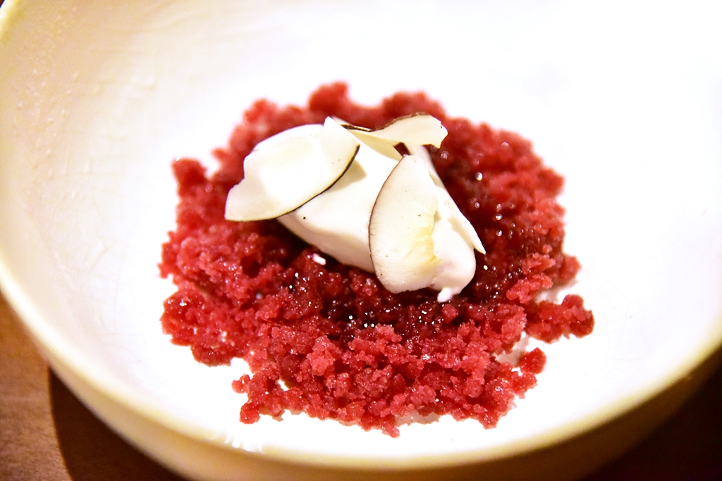 17th course: Pomegranate Granita, coconut – ไอศกรีมเกล็ดน้ำแข็งรสทับทิมเสิร์ฟคู่กับไอศกรีมมะพร้าวเนื้อหวานมัน