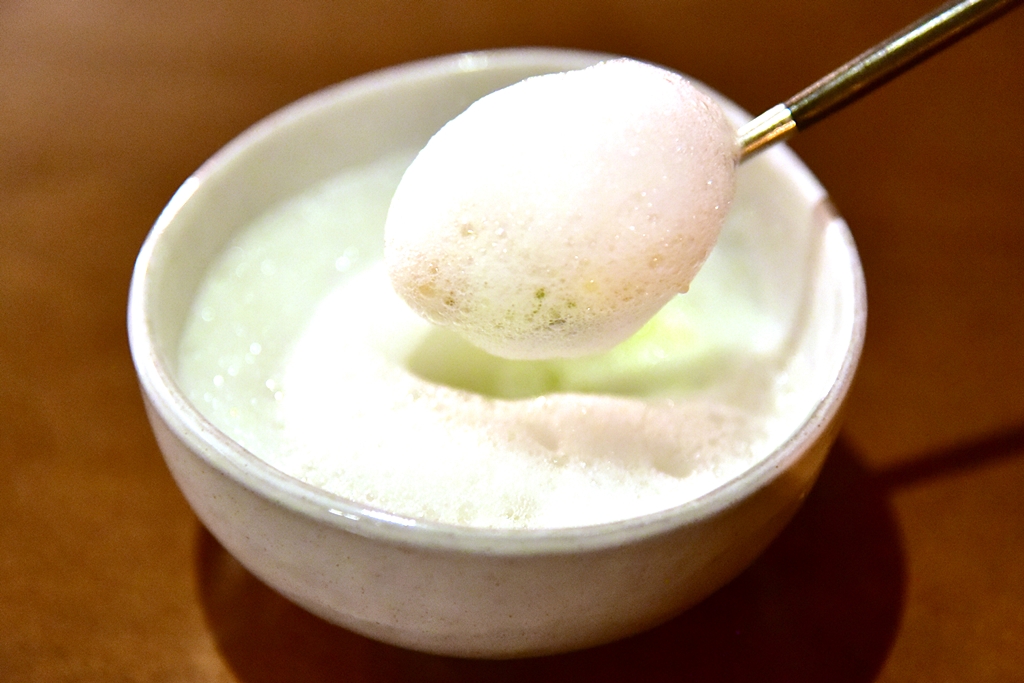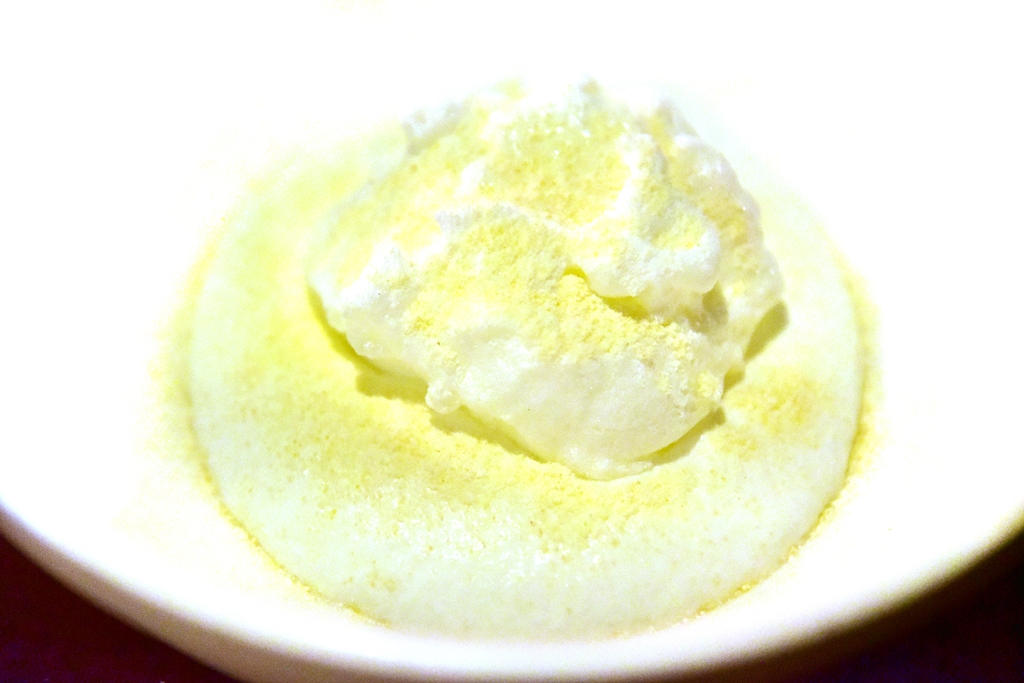 4th course: Seaweed Mousse, spider crab, sea water foam – มูสสาหร่ายนุ่มๆหอมๆเสิร์ฟคู่กับเนื้อปูสไปเดอร์แคร้บหวานๆและโฟมน้ำทะเลรสเค็ม ถือว่าแปลกมาก !! เหมือนกินน้ำทะเลจริงๆเลย…