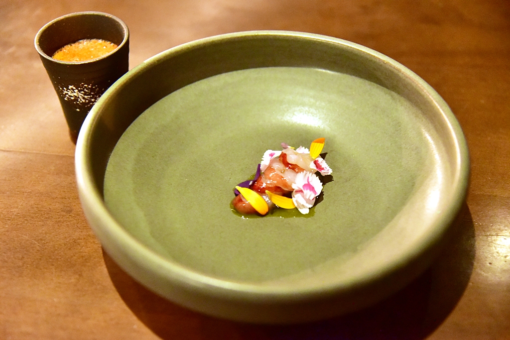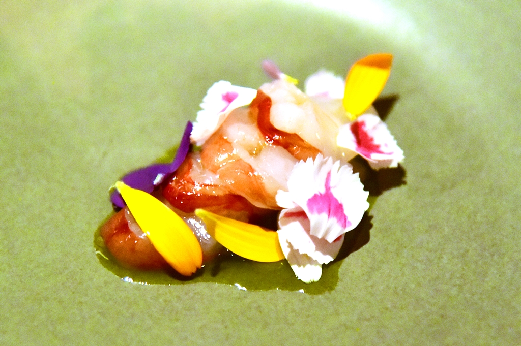 9th course: Shrimp Ceviche, gazpacho – เนื้อกุ้งดิบสดๆหวานหอมเสิร์ฟในซอสพริกรสเข้มข้นคู่กับซุปกัสปาโช่เนื้อกุ้งรสเข้มมมมม มาก !!