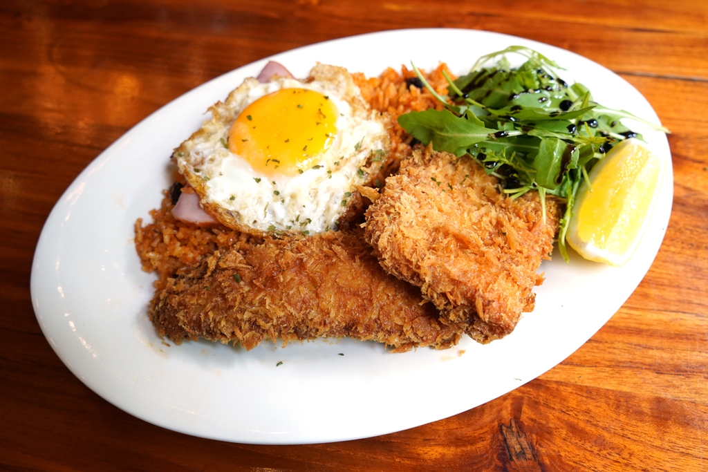 2. Sea Bass Beurre Blanc AFR (395++ THB) [13/10] – ข้าวผัดอเมริกันทานคู่กับปลากระพงชุบเกล็ดขนมปังทอดราดซอสเบอร์บลองค์เสิร์ฟคู่กับไข่ดาวและสลัดผักร็อกเก็ต
