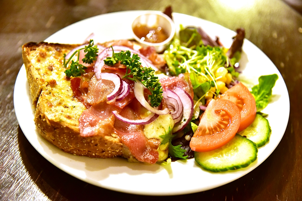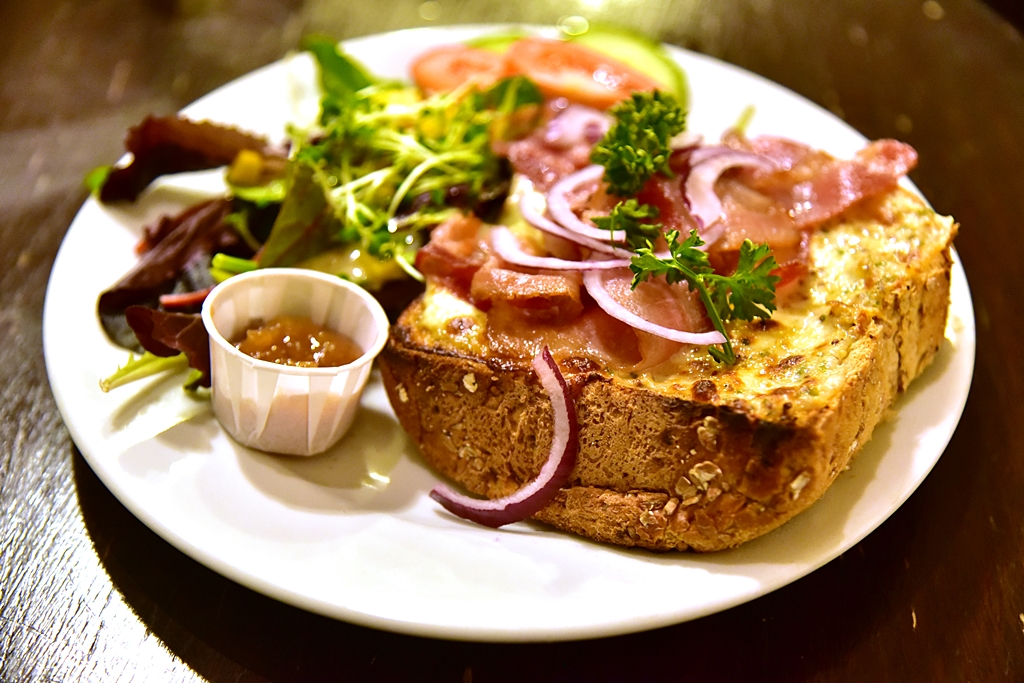 1. Welsh Rarebit (8.95 GBP) – ขนมปังปิ้งหน้าชีสผสมมัสตาร์ดเสิร์ฟพร้อมกับเบค่อนย่างชิ้นใหญ่และสลัดผัก