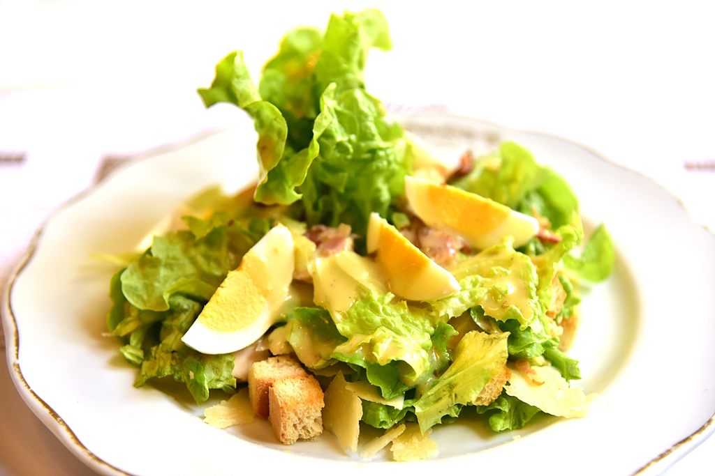 3. Caesar Salad with Chicken (18.00 EURO) – ซีซาร์สลัดรสเข้มข้นพร้อมด้วยไข่ไก่ต้ม ไก่ย่างและเบค่อนกรอบ