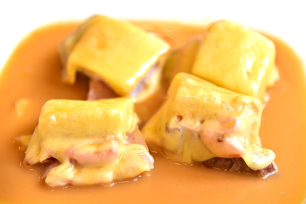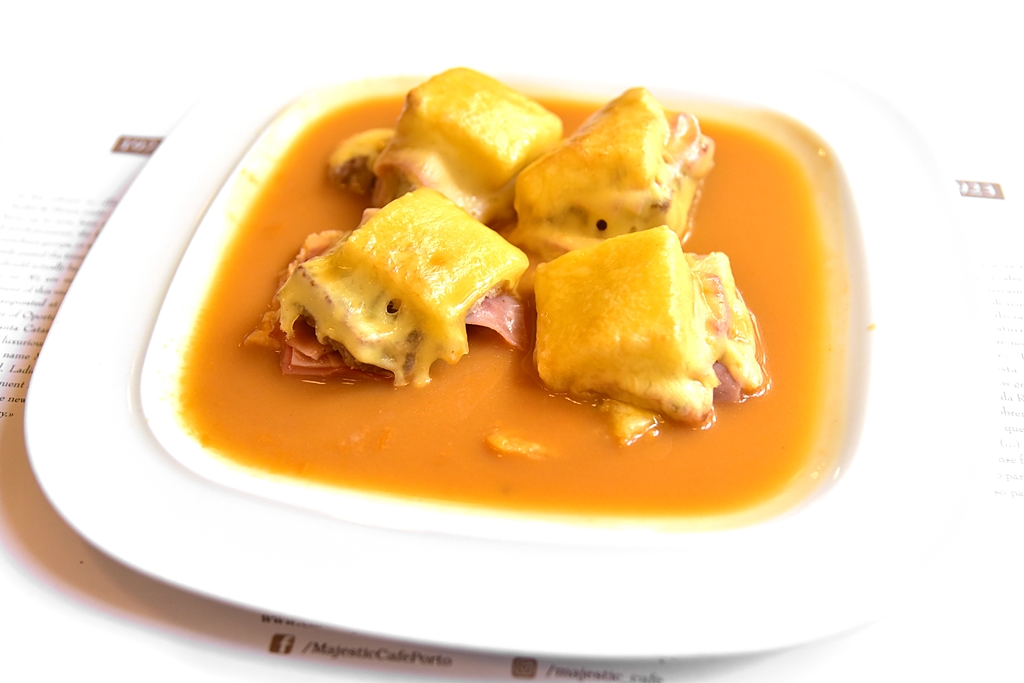 1. Francesinha, steak, spiced sausage, ham, cheese and special sauce (20.00 EURO) – แซนด์วิชโปรตุเกสสอดไส้สเต็กเนื้อ ไส้กรอก แฮมและชีสราดด้วยซอสสูตรพิเศษที่อร่อยจัดเต็มปริมาณแคลอรี่มากๆ