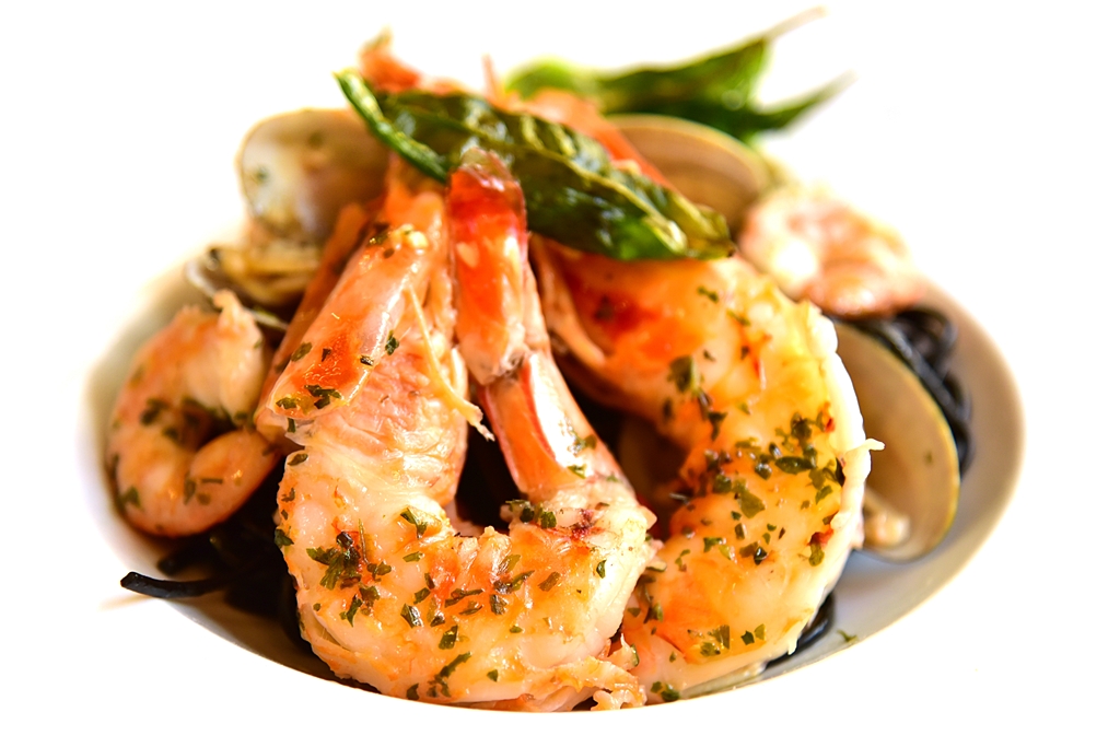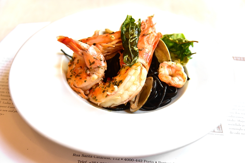 4. Linguine al Nero con Gamberi Gigante (25.00 EURO) – พาสต้าเส้นดำผัดกับหอยและกุ้งลายเสือตัวใหญ่ยักษ์ที่ย่างออกมาได้ดีงามมาก