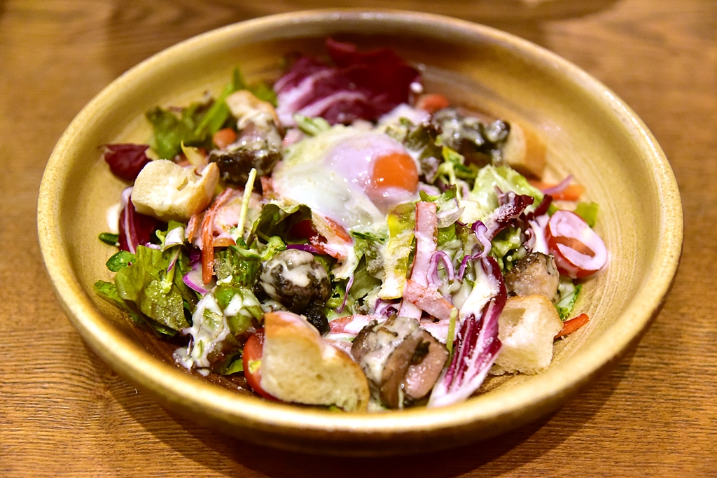 3. Caesar Salad (950 Yen) – ซีซาร์สลัดชามยักษ์เสิร์ฟพร้อมกับไข่ออนเซนและเนื้อไก่ย่าง