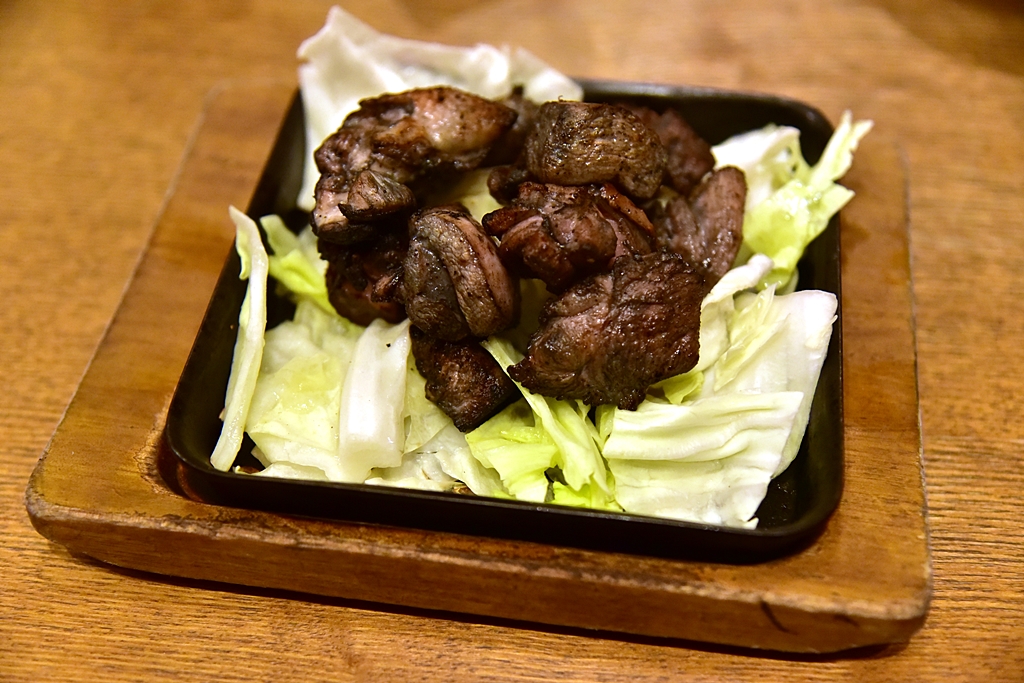1. Charcoal Grilled Chicken (2,480 Yen) – เนื้อไก่ย่างถ่านหมักซอสสไตล์มิยาซากิเสิร์ฟในกระทะร้อนพร้อมกับกะหล่ำปลี