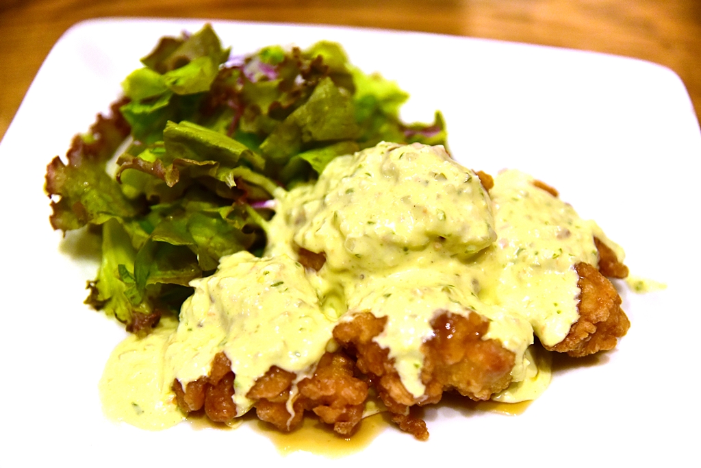 2. Chicken Nanban (880 Yen) – ไก่ทอดชิ้นโตเนื้อฉ่ำราดซอสทาร์ทาร์เสิร์ฟคู่กับสลัดผัก สั้นๆครับ ไก่จานนี้ ข้าวและเบียร์คือที่สุด