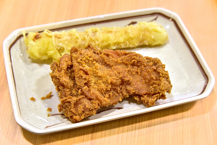 4. Chikuwa Tempura (29 THB) & Spicy Fried Chicken (39 THB) – เทมปุระปลาหมึกหลอดและไก่ทอดสไปซี่ที่ถ้าทานเปล่าๆคงจะเย็น ชืดและไม่ค่อยอร่อย แต่พอมาทานร่วมกับอุด้งร้อนๆนี่ฟินเลย